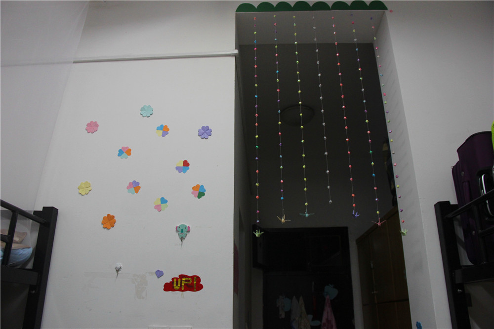 在11月9日的寝室互访日中,我们惊喜地发现,广大学生充分发扬个性,将千篇一律的寝室装扮得别致美丽,各具特色。例如,8幢302寝室为自己寝室起名“沉香阁”,为体现沉香阁的特色,女孩儿们舍弃艳丽的色彩,舍弃成品,仅凭一双巧手,裁剪出多样的青春风采。用千纸鹤组成的别样珠帘,表现了女孩儿们对寝室,对未来的美好期许。在以“仲夏星之夜”为主题进行美化的8幢111寝室中,选手们将夜光珠串在一起,做成珠帘,在黑暗中显现出幽深神秘的美,饰以星星和月亮的壁纸,让整个寝室显得幽静动人。在8幢304寝室中,同学们买来各式的墙纸与卡通人物贴在墙上,将寝室装扮得意趣盎然。而在8幢303寝室中,为打造温馨之家,寝室成员用自己的拼音字母组成各式壁饰,表达了自己对寝室的热爱与寝室成员之间的深厚情谊。此外,其他参赛寝室的匠心独运也让人惊喜,寝室面貌焕然一新,让人流连。