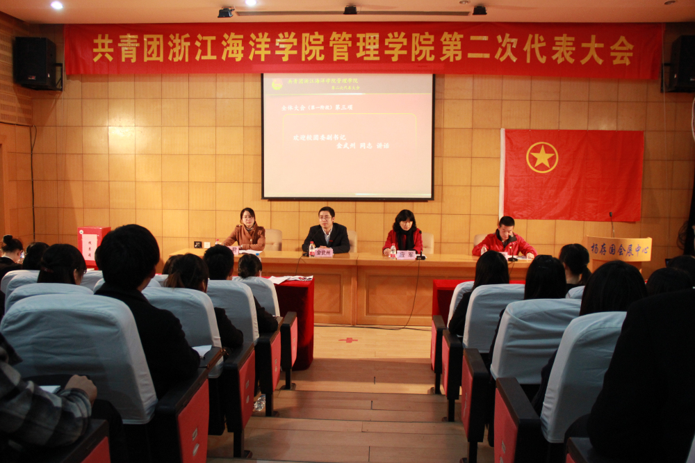 校团委副书记金武州老师首先代表共青团浙江海洋学院委员会对本次大会的召开表示热烈的祝贺,同时他对best365官网共青团工作给予了充分肯定和高度评价。他指出,全国正在贯彻学习党的“十八大”精神,全省正在积极推进舟山群岛新区的建设,促进舟山的经济建设和社会发展,努力创建bat365官网登录在线主页是目前我校的重要工作内容。共青团管理学院委员会紧紧围绕学校中心工作,积极开展校园文化活动,打造专业品牌活动,继续推进百篇经典阅读,努力提高学生人文素养,积极参加社会实践和志愿服务活动。金书记对best365官网在学科竞赛、挑战杯等上的杰出成绩也给予了充分肯定,他希望best365官网能够继续努力,再创佳绩。金武洲老师提出,愿每个女生都是白富美,白在品行,富在德行,美在心灵,愿每个男生都是高富帅,高在学识,富在精神,帅在行动。最后金武洲老师预祝本次会议圆满成功。