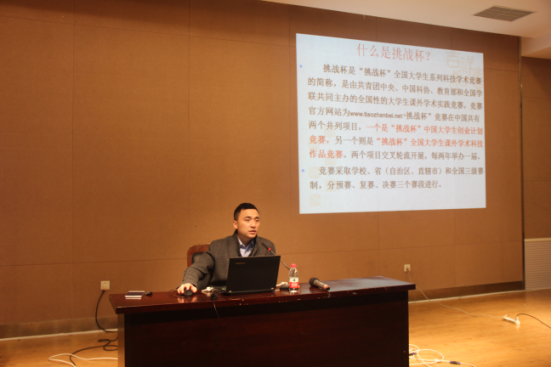 12月15日晚18:00,由韩志老师进行讲解的“挑战杯”全国大学生课外学术科技作品竞赛的培训讲座在杨存国2号厅举行。