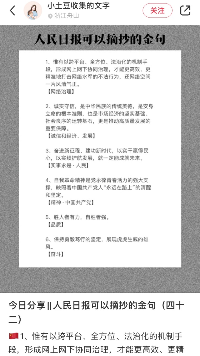 “从去年9月份开始,我就每天看《人民日报》,包括这份报纸的官方微博,然后摘抄里面的好句子好段落。”童思凡说,起初,她把摘抄的这些“金句”放在“小红书”上,是想自己留着没事拿出来看看,算是自己积累“金句”的平台。因为持续更新,“小红书”的后台给了她更多“流量”。