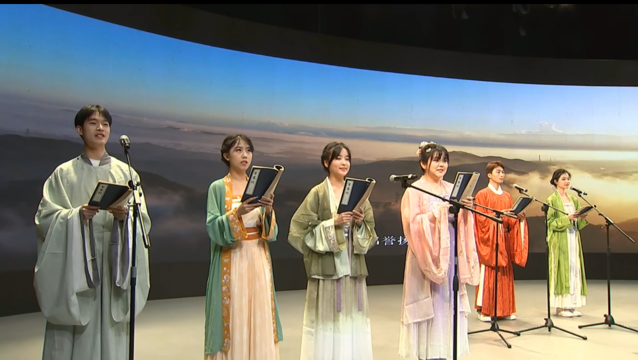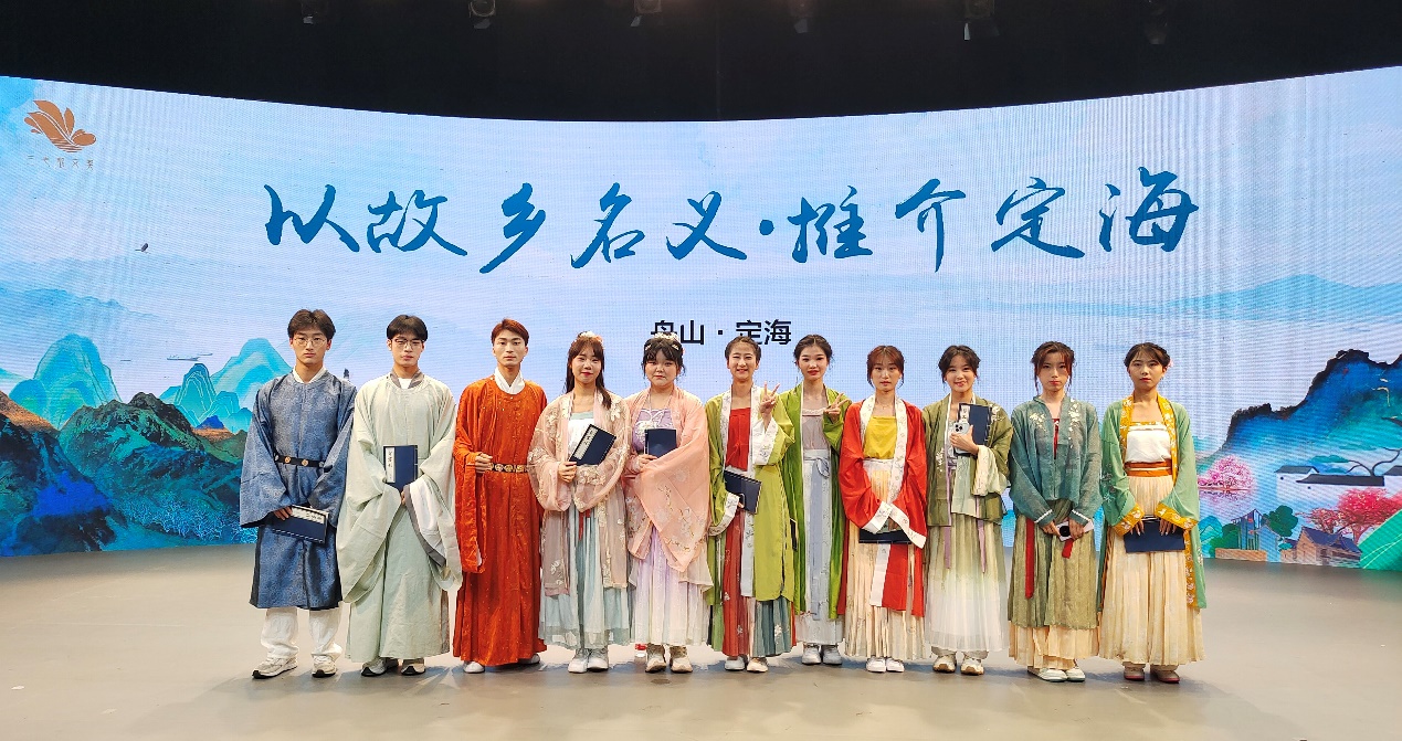 在演播厅内,同学们身着仙气飘逸的汉服,在灯光下闪烁着光芒,每一位都仿佛是从古画中走出的人物。同学们手持卷轴,吟诵着宋代柳永的词作《留客住(林钟商)》。清朗的人声、古筝的旋律和定海古城的视频交织在一起,演绎出穿越时空的美妙乐章,让在场的每一个人都身临其境,感受到那份留别的深情厚意。“此次吟诵是希望能让在场的观众感受到定海古城的独特魅力和历史深度,对于我自身而言,也更深刻地认识了三毛对家乡草木与人情的深厚情感。”来自学院A22财务2班的本科生李明彦这样说道。“舟山不大,定海更像是地图上的一颗图钉,幸运的是,孕育和遇见了三毛。有幸能以这样特别的形式怀念三毛、推介定海,感受三毛的人生态度与生命哲学。”来自学院Y22农发班的研究生李冲这样感慨道。