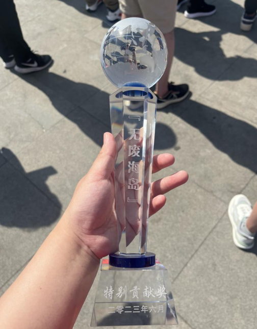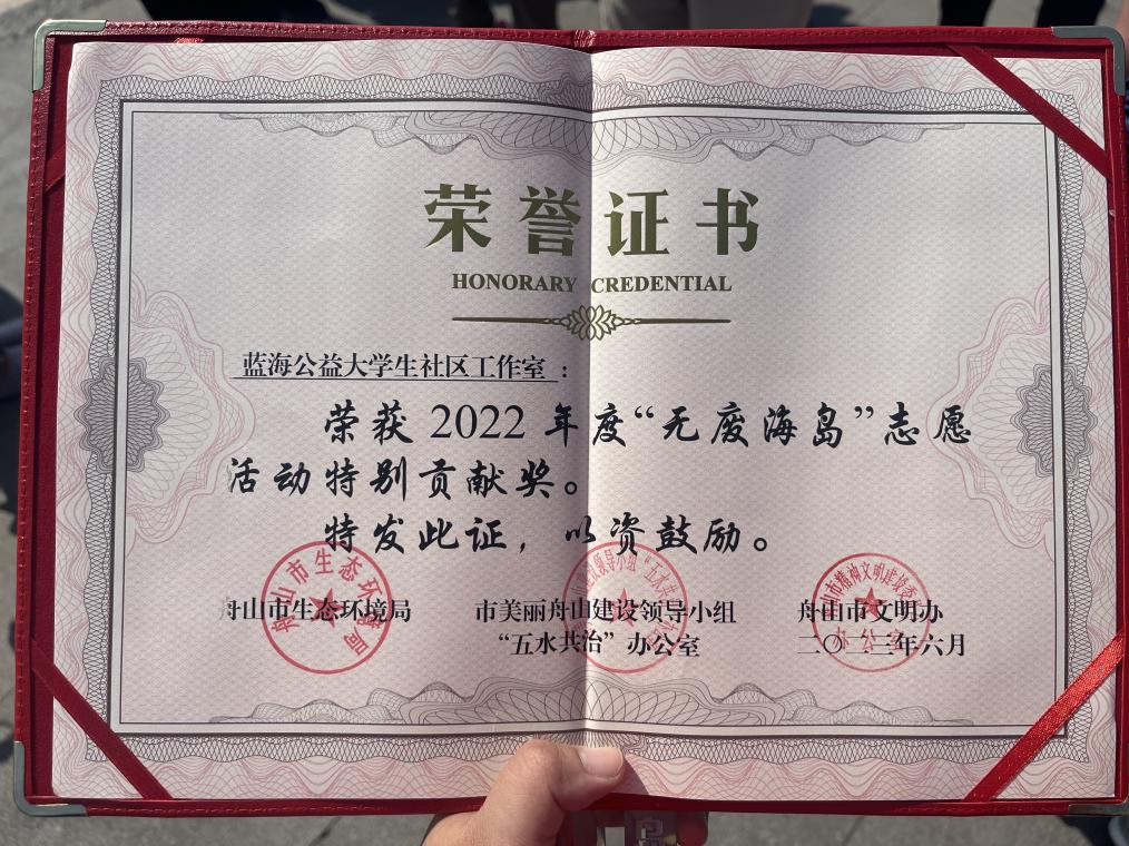 在仪式上,蓝海公益大学生社区工作室作为环保志愿队伍之一,被授予“2022年度‘无废海岛’志愿活动特别贡献奖”。