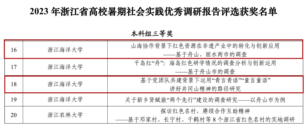 近日,由中共浙江省委宣传部、浙江省文明办、浙江省教育厅、共青团浙江省委、浙江省关心下一代工作委员会、浙江省学生联合会联合主办的2023年浙江省高校暑期社会实践优秀调研报告评选决赛圆满结束。本届大赛全省共有94所高校限额推报606份调研报告进入省赛初赛,经过书面评审,共141份调研报告入围省赛决赛。best365官网bat365官网登录在线主页“遗山遗水,奔‘富’山海”实践团和best365官方网站登录入口“井冈铸魂,舟青赋能”党史学习实践团2支实践团申报的调研报告荣获三等奖。同时,bat365官网登录在线主页“遗山遗水,奔‘富’山海”实践团还在2023年舟山市“家燕归巢”大学生暑期社会实践活动中,荣获“优秀实践队”。
