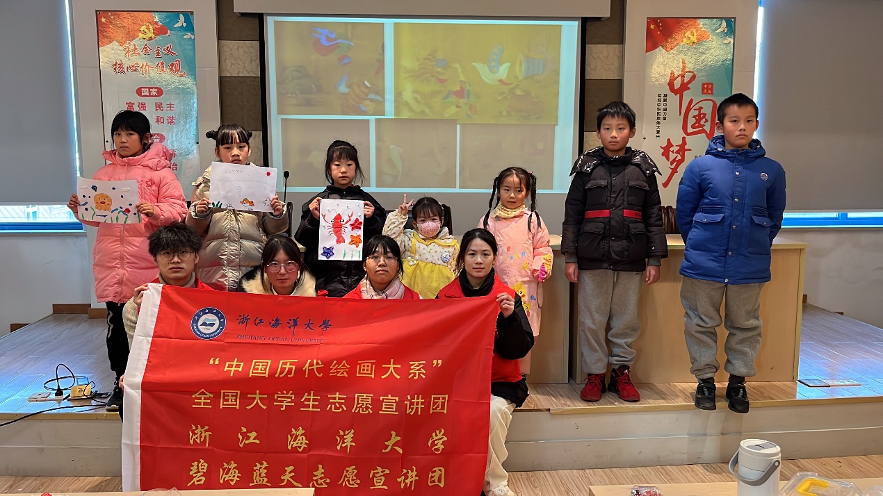 宣讲团成员以中华文明“连续性、创新性、统一性、包容性、和平性”的五大特性为核心,通过小课堂的形式宣讲各类绘画作品,深入浅出地传授中国历代绘画大系的知识。志愿者们运用生动的图片和文字,向小朋友们普及绘画的相关概念。此外,他们也巧妙地将海洋元素融入中华书画,为宣讲增添了更多趣味和活力。