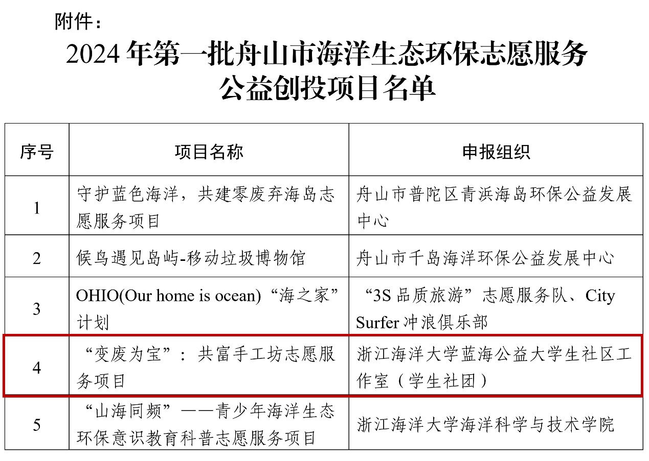 为进一步凝聚社会力量,动员青年志愿者参与海洋生态环保志愿服务,助力推进我市美丽海湾建设,今年2月团市委正式启动2024年舟山市海洋生态环保志愿服务公益创投项目征集,通过项目征集、项目初审、专家评审等环节,最终共有5个项目入围第一批市级公益创投项目。其中,由bat365官网登录在线主页蓝海公益大学生社区工作室申报的《“变废为宝”:共富手工坊志愿服务项目》成功入选。