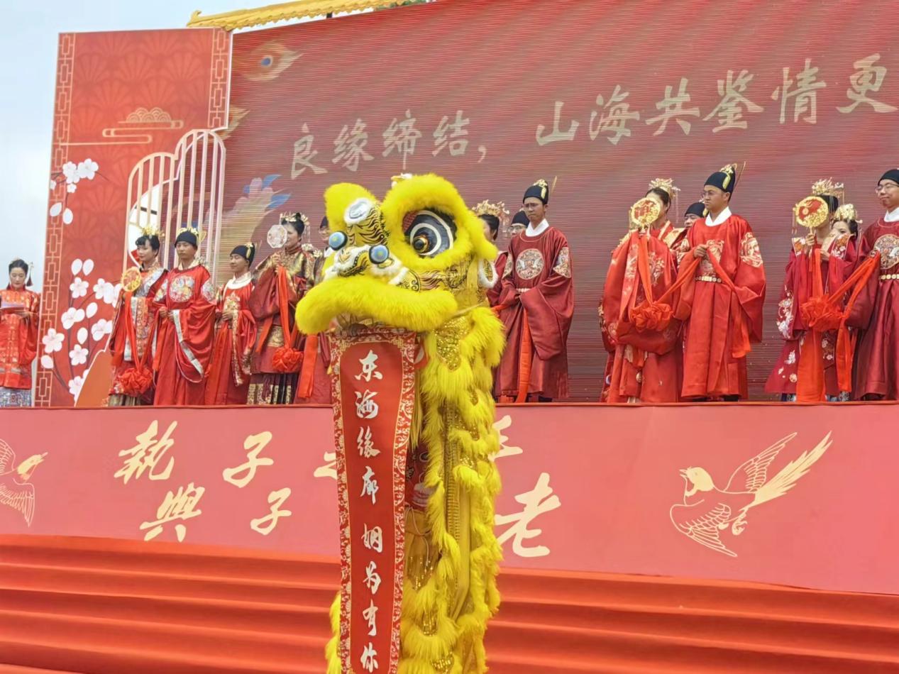 定海区人才集体婚礼在状元阁举行,志愿者们与现场游客一同观赏这场重大婚礼。在婚礼现场,10对新人在舞狮的引领下,在亲友及观礼嘉宾的注目下,身着明制婚服,共赴一场“中式浪漫”。在典雅而庄重的仪式里,传承着中国人的文化与民俗。