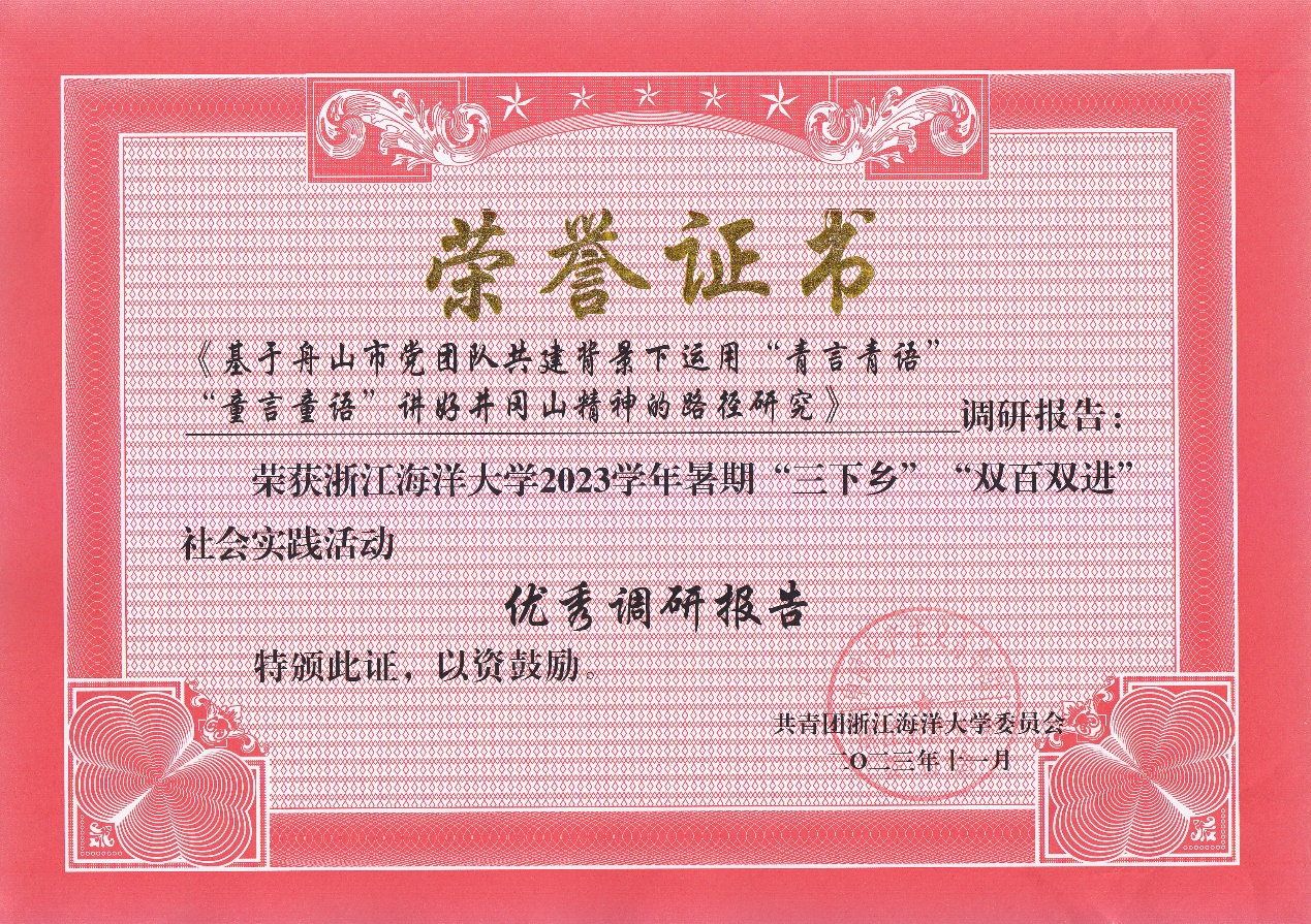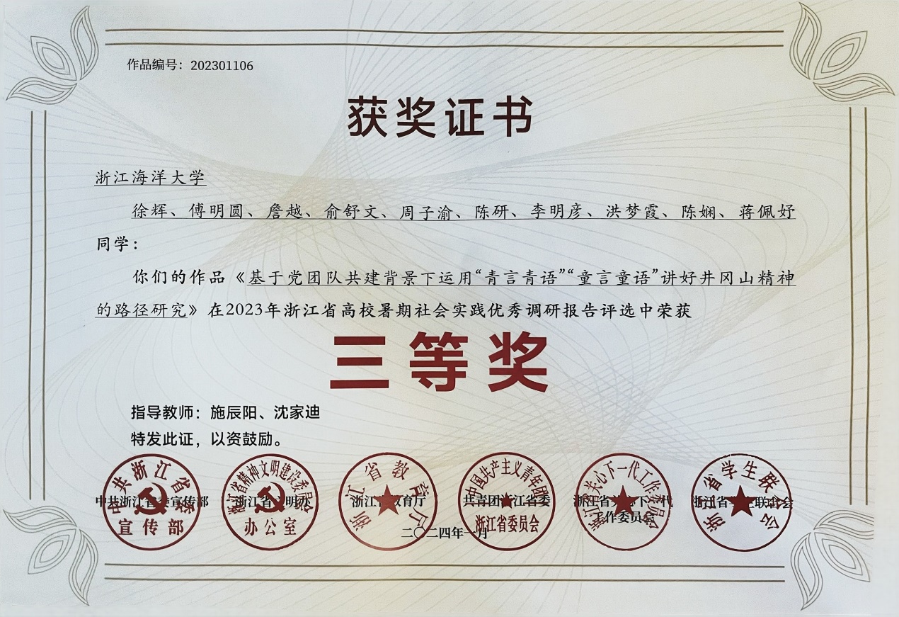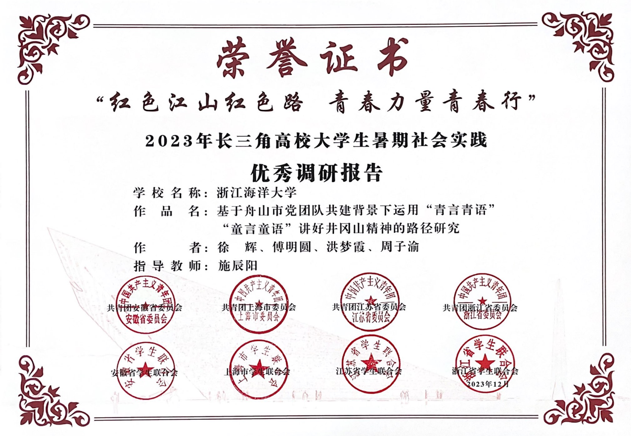 从全国招募的104支大学生组成实践团队,赴井冈山开展党史学习、红色教育等专项实践活动,该活动在广大青年学生中产生积极影响。最终,评选出38件“优秀课题成果”和12支“优秀团队”。其中,由best365官方网站登录入口“井冈铸魂,舟青赋能”党史学习实践团撰写的《基于舟山市党团队共建背景下运用“青言青语”“童言童语”讲好井冈山精神的路径研究》荣获“优秀课题成果”。