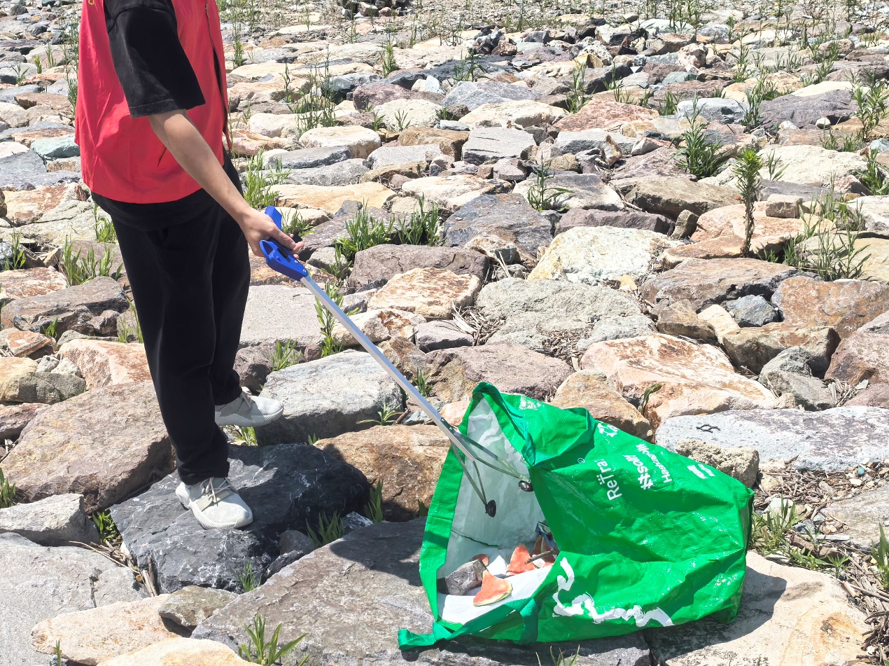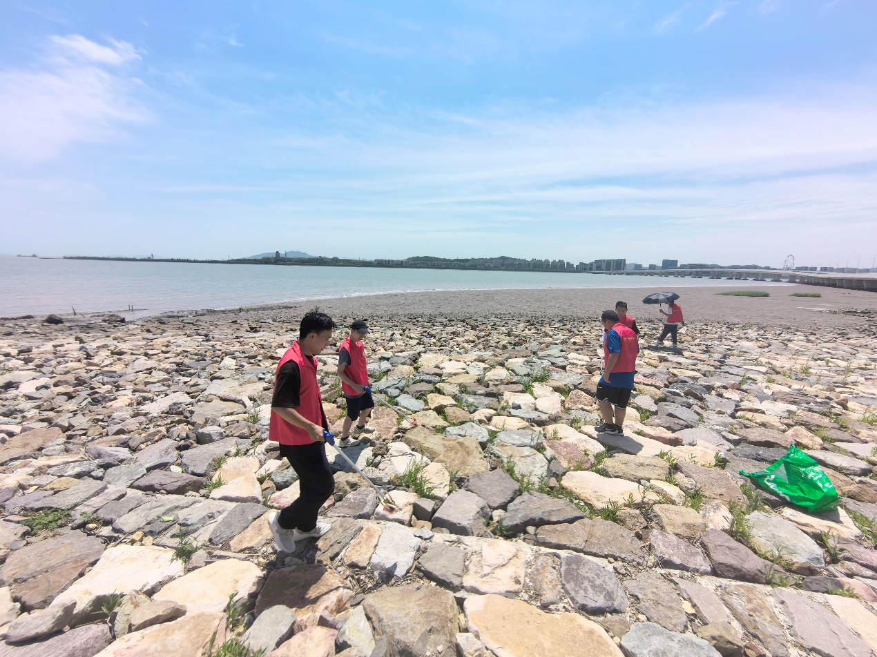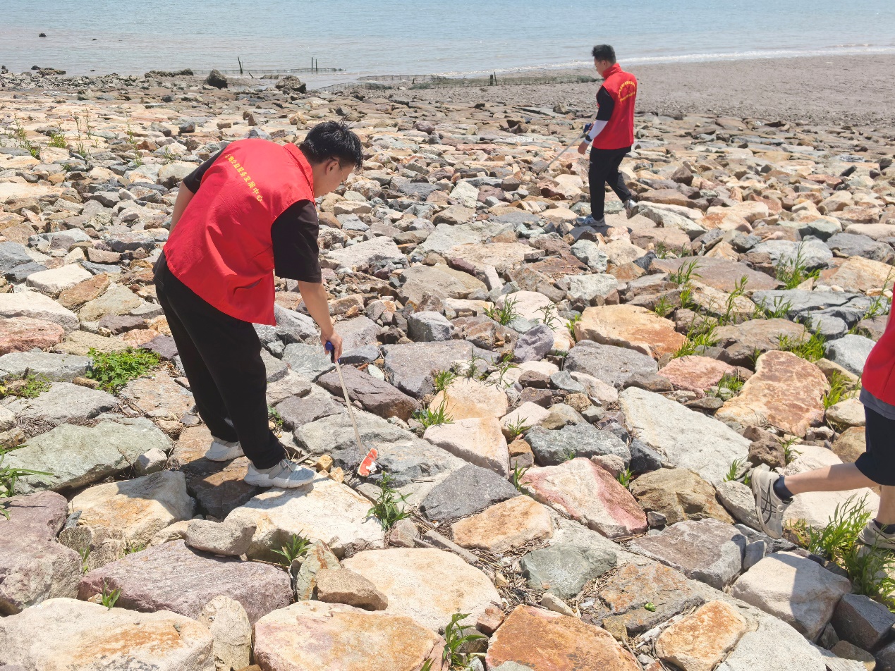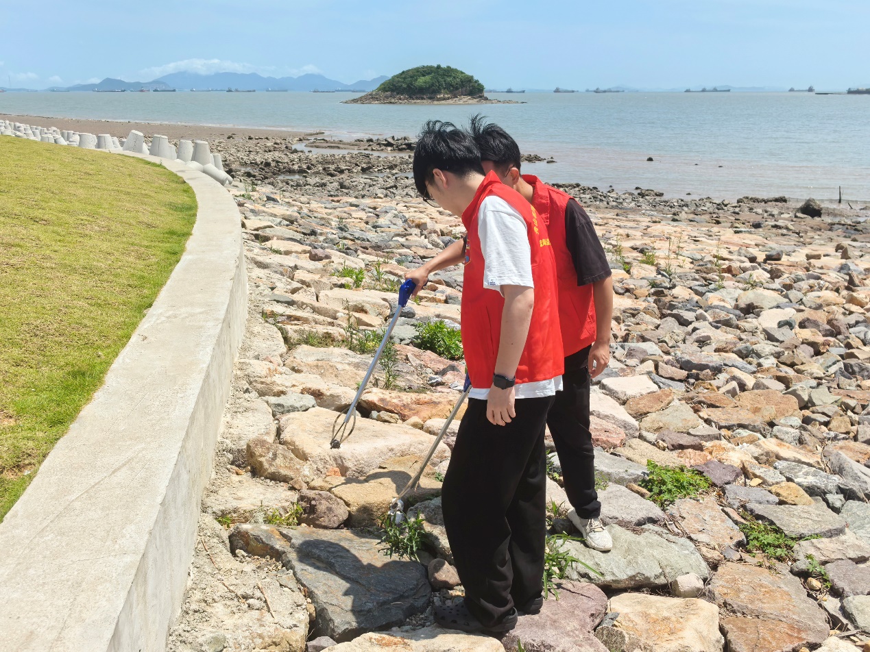 志愿者们纷纷化身“环保卫士”“海洋守护者”,手持夹钳和环保袋,或半蹲、或弯腰,耐心夹取食品袋、塑料瓶、废纸屑、干枯海草、烟头等垃圾。尽管烈日炎炎,同学们额头上的汗水顺着脸颊滑落,但大家净滩的热情不减,脚踏实地、埋头苦干的身影,成为这片滩涂最亮丽的风景线。志愿者们还积极完成垃圾分类称重、转运处置等后续工作。这片刚刚被清理过的滩涂,再次呈现出它原始的纯净与美好,仿佛在向大家证明,每一个微小的努力都能汇聚成保护海洋的强大力量。
