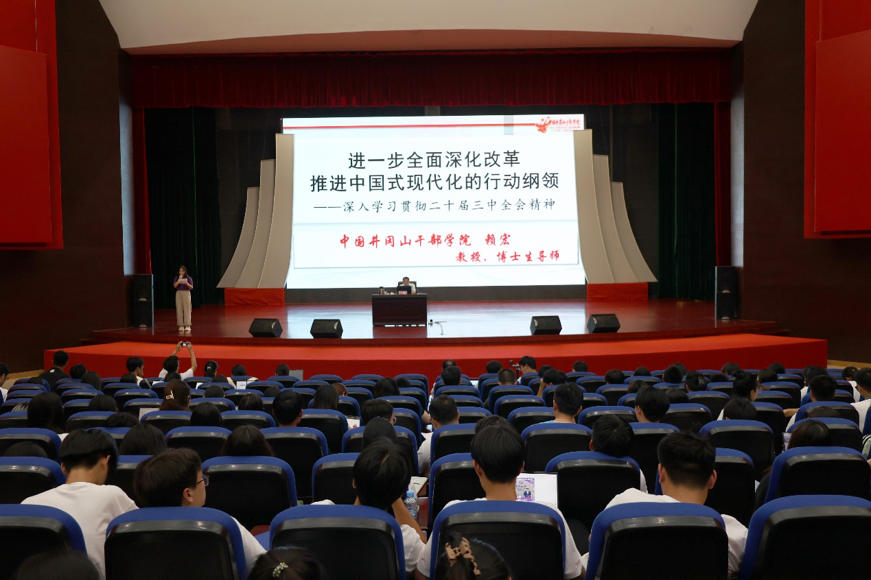 实践团在全国青少年井冈山革命传统教育基地聆听了一场以《进一步全面深化改革 推进中国式现代化的行动纲领——深入学习贯彻二十届三中全会精神》为主题的党课。党课由中国井冈山干部学院赖宏教授主讲。赖宏教授运用丰富史实、生动案例、翔实数据对全会精神进行系统宣讲和深入阐释,激发了团队成员大力弘扬井冈山精神,在中国式现代化建设中挺膺担当的决心。
