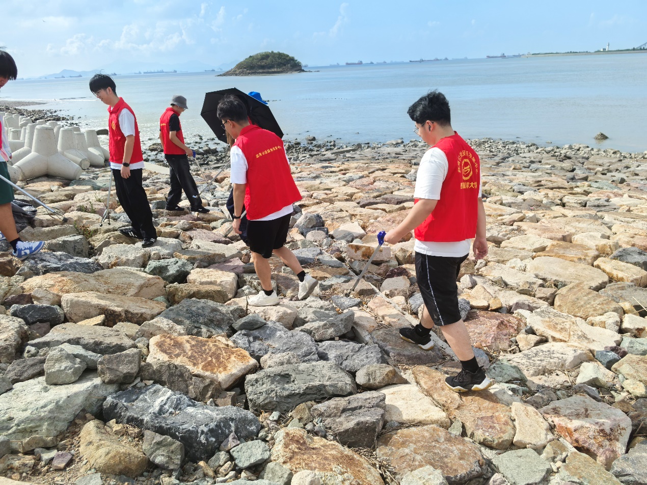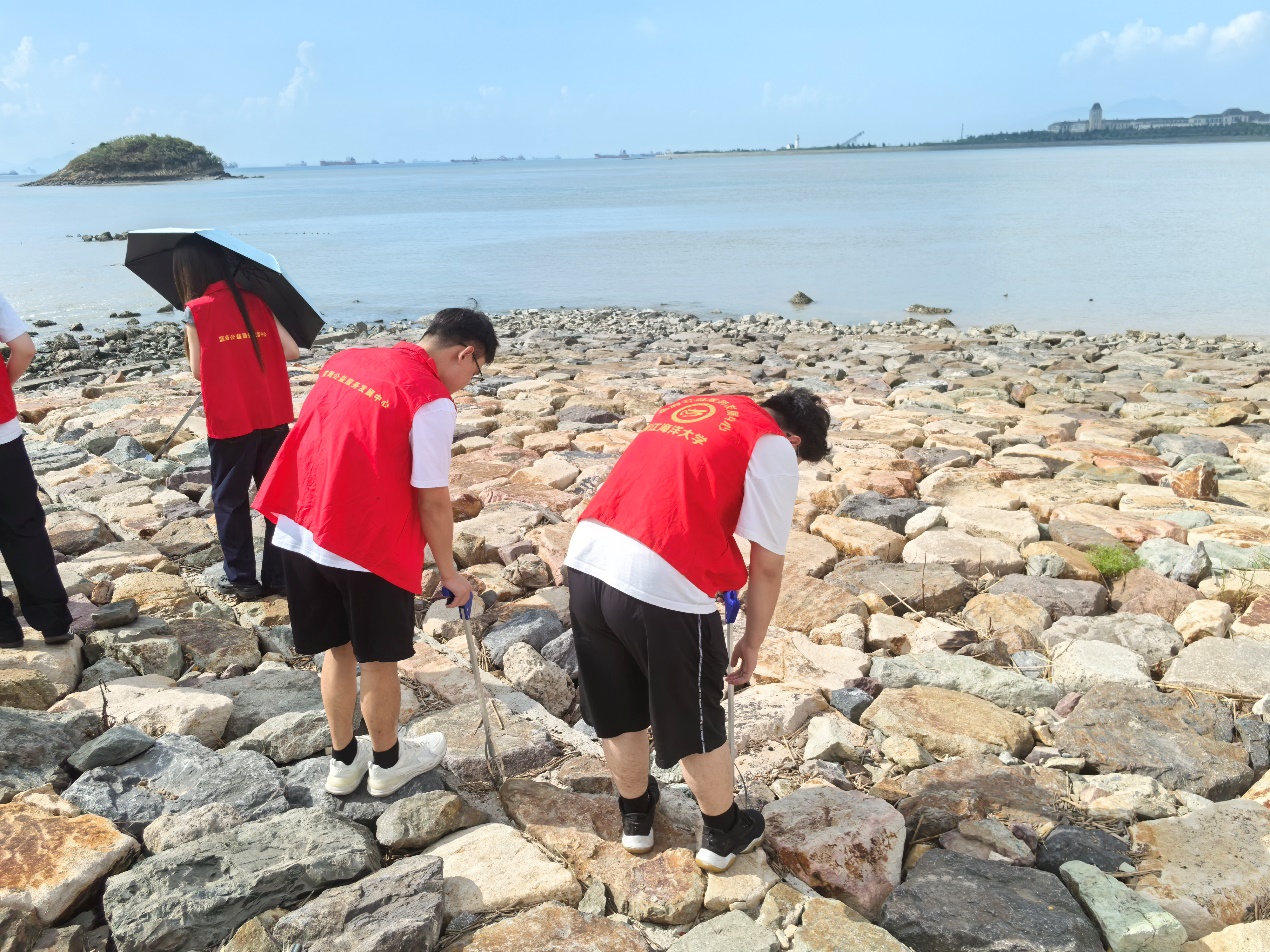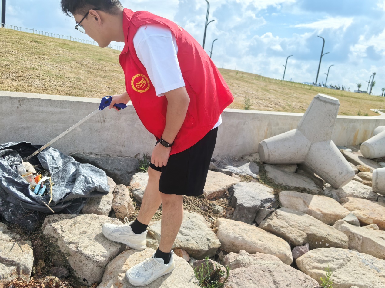志愿者们纷纷行动,他们手持垃圾夹和环保袋,或蹲下、或弯腰,细心地捡拾食品包装袋、塑料瓶、废纸屑、枯萎的海草和烟头等垃圾。尽管烈日炙烤,汗水从同学们的额头滑下,但他们清理海滩的热情丝毫不减,认真工作的身影成为这片滩涂上最亮丽的风景。志愿者们还积极承担了垃圾分类、称重、转运等后续工作。经过清理,这片滩涂恢复了它本来的洁净与美丽,仿佛在告诉大家,每一份小小的努力都能汇聚成保护海洋的巨大力量。
