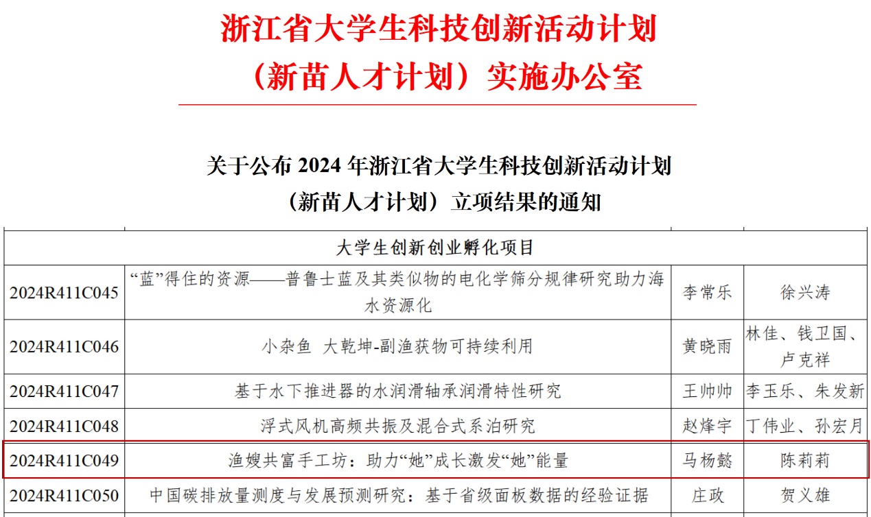 2024年3月22日,由社团成员马杨懿申报的《渔嫂共富手工坊:助力“她”成长激发“她”能量》项目获得2024年浙江省大学生科技创新活动计划暨新苗人才计划立项。