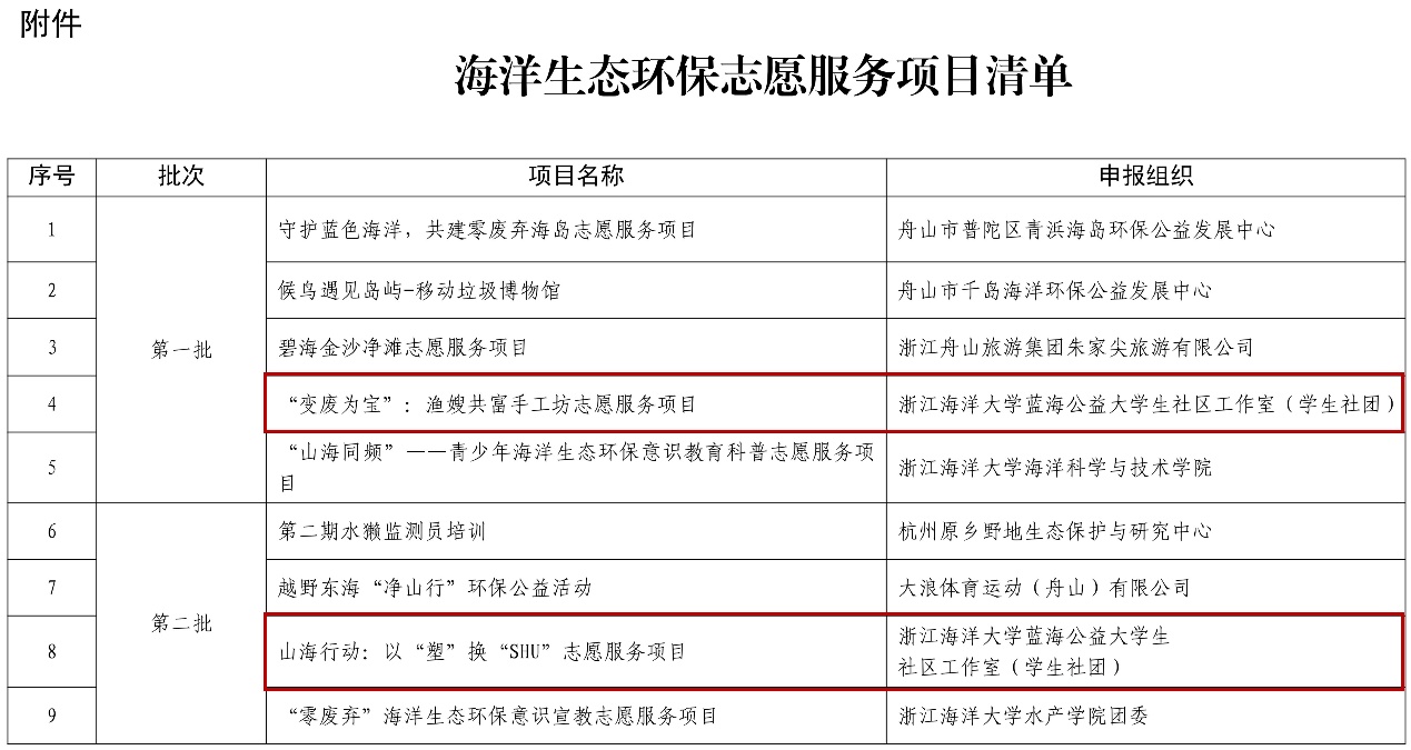 2024年3月,社团申报的《“变废为宝”:渔嫂共富手工坊》志愿服务项目获评2024年第一批舟山市海洋生态环保志愿服务公益创投项目;2024年9月,社团申报的《山海行动:以“塑”换“SHU”》志愿服务项目参加舟山市第二批海洋生态环保志愿服务项目评审。