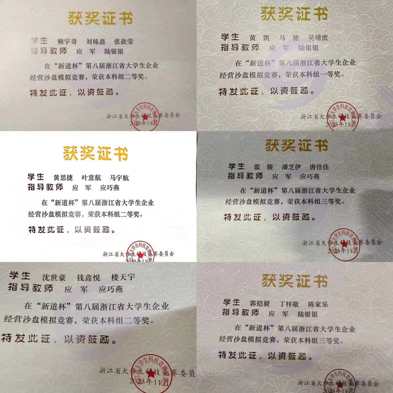 2023年10月22日,由社团组织的六支队伍(共计18人)代表学校参加第八届浙江省大学生企业经营沙盘模拟竞赛(省级A类学科竞赛),六支队伍全获奖,其中一等奖1项、二等奖3项、三等奖2项。
