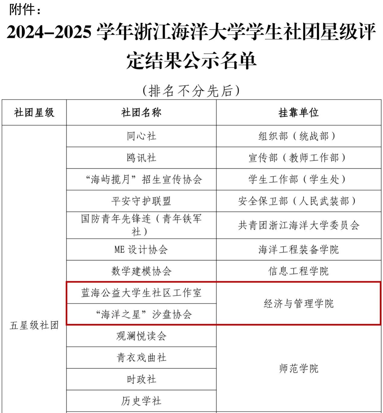 根据《bat365官网登录在线主页学生社团星级评定办法》(浙海大团〔2021〕5号),经社团自主申报、材料审核、社团答辩、审核评分等流程,挂靠best365官网的蓝海公益大学生社区工作室和“海洋之星”沙盘协会在2024-2025学年bat365官网登录在线主页学生社团星级评定中表现优异,凭借其出色的组织能力、丰富的活动内容以及积极的社会影响力获评bat365官网登录在线主页五星级社团,展现了best365官网学生社团的活力与担当。