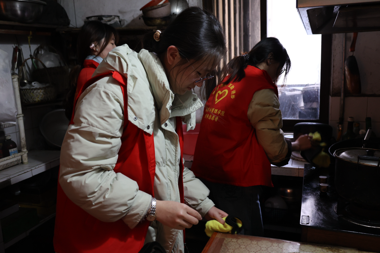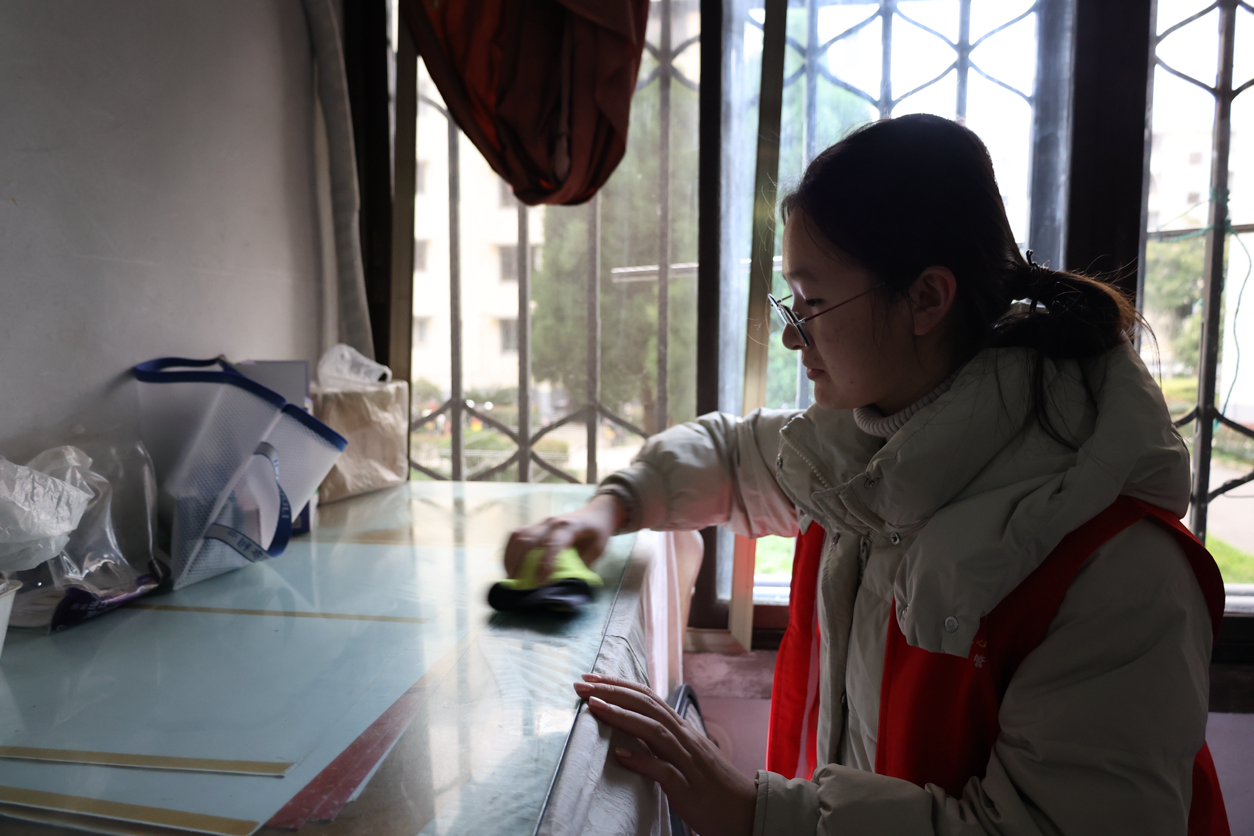 随后,志愿者们马不停蹄地来到了独居老人家中,开启了第二轮打扫。面对老人们因腿脚不便而难以打理的家居环境,志愿者们没有丝毫犹豫,迅速投入到清洁工作中。他们分工明确,有的人负责擦拭窗户和门框,有的人则整理杂物和厨具。此外,志愿者们还细心检查了老人们家中的电线安全,并耐心地与老人们交谈,倾听他们的心声,询问他们的生活状况和需求,既保障了他们居住环境的安全,也为他们带去了精神上的慰藉。