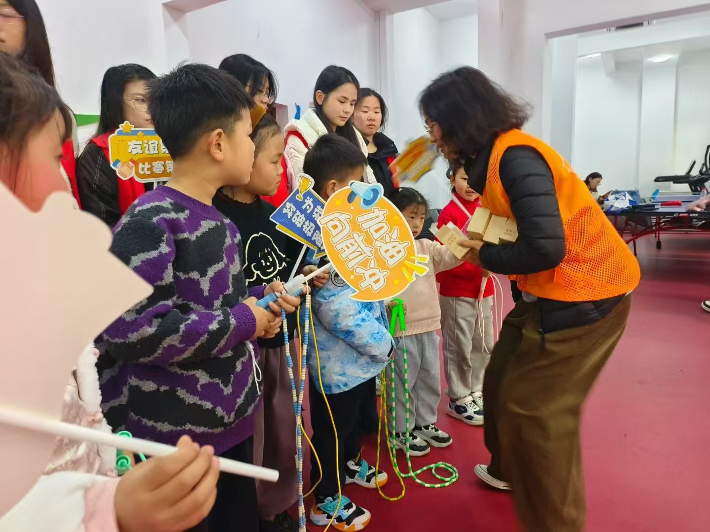 活动尾声,表现优异的孩子们都收到了小小的奖励与大大的肯定,孩子们脸上洋溢着自豪的笑容,兴奋地与同伴分享喜悦。志愿者们也为每一位参与的孩子送上鼓励,整个活动现场充满了欢声笑语,志愿者们为孩子们注入了更多运动的动力与热情。