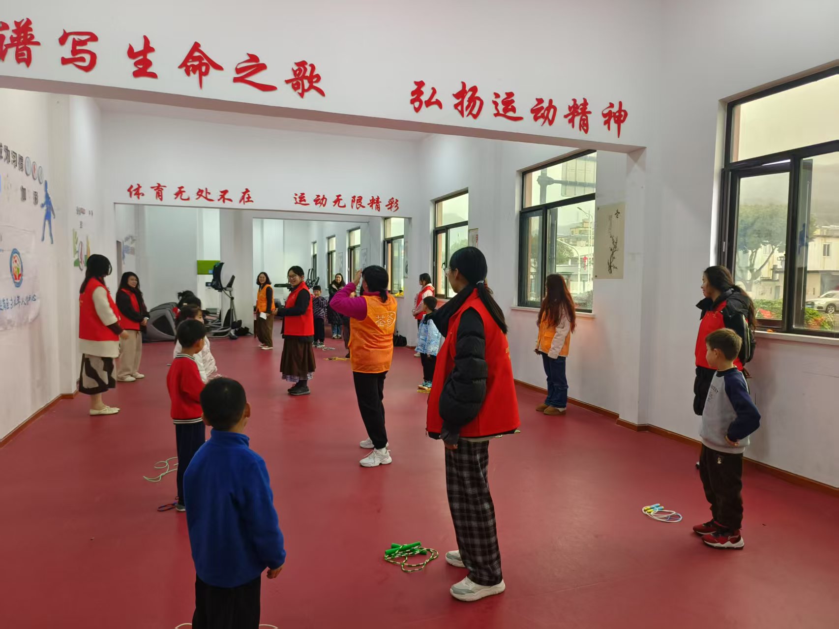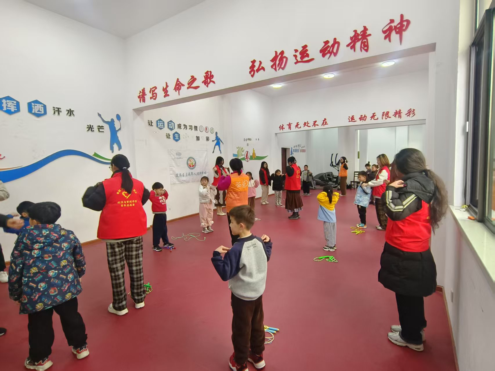 活动伊始,志愿者们身着志愿服,与孩子们整齐列队。教练详细讲解安全事项后,带领全体参与者进行热身运动。压腿、转腕、弓步拉伸……志愿者们一边示范动作,一边鼓励孩子们舒展筋骨,为接下来的跳绳挑战做好准备。