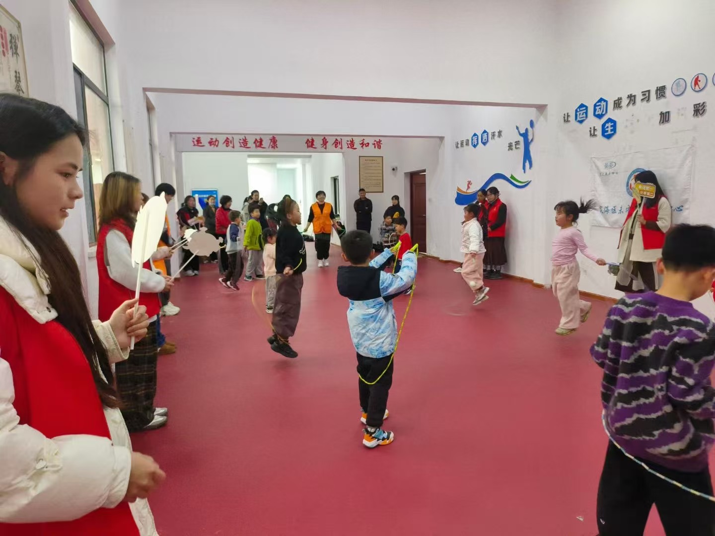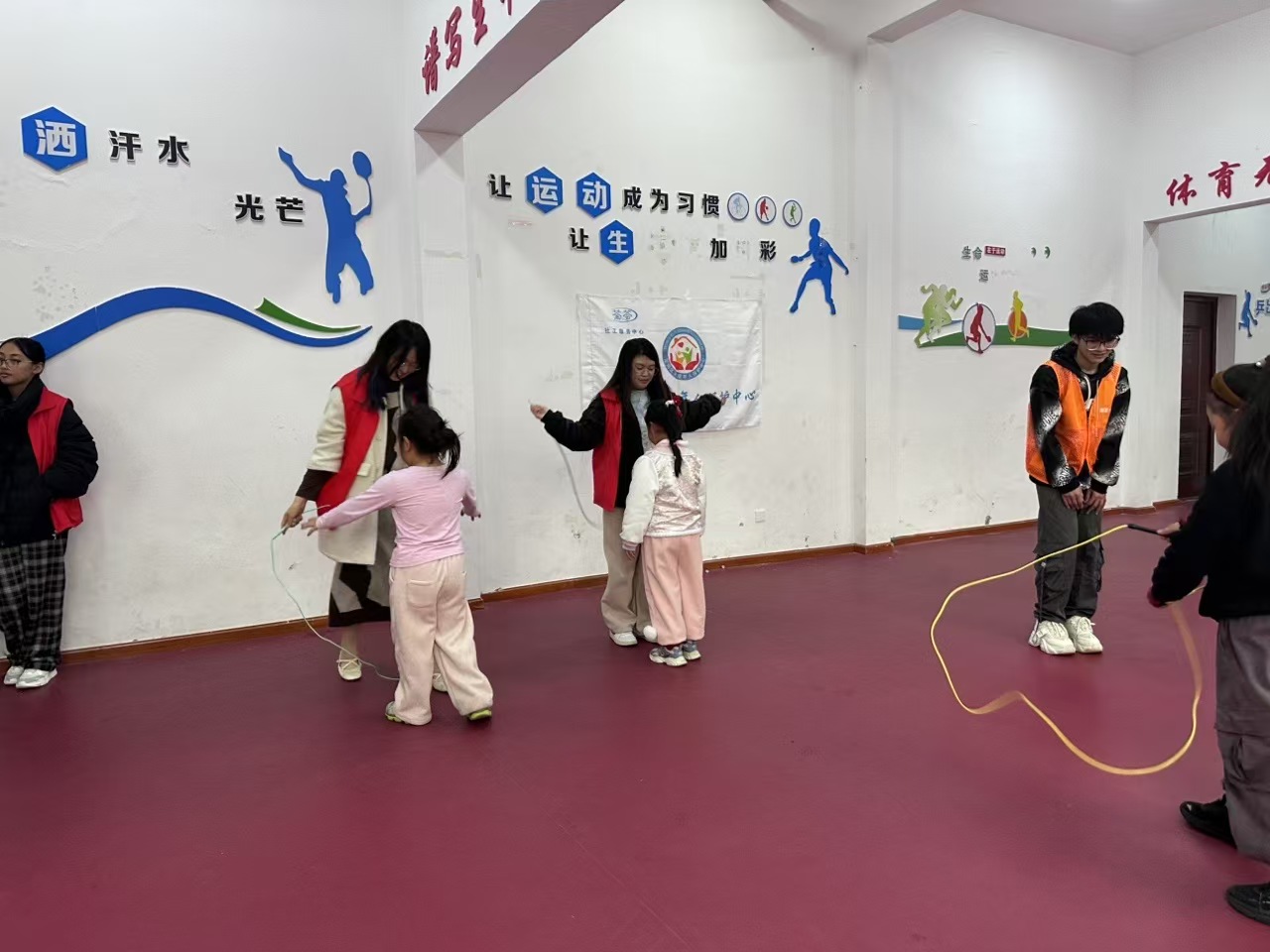 热身结束后,教练现场演示花样跳绳技巧。志愿者们协助配合,分组指导孩子们握绳姿势与起跳节奏,在欢声笑语中,孩子们逐渐掌握动作要领。