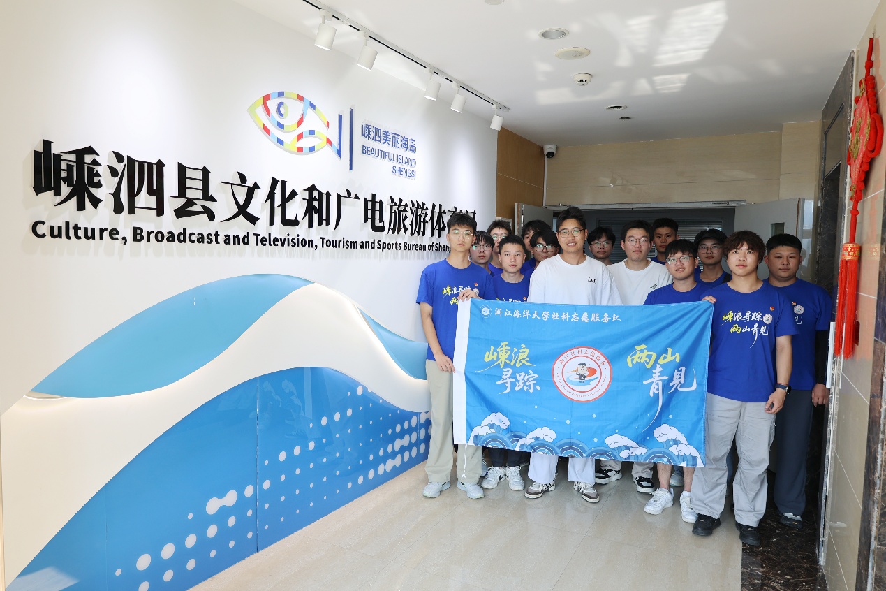 第二站,服务队来到嵊泗县文化和广电旅游体育局。文广旅体局产业发展规划科文化和旅游信息服务中心副主任吴子翰向服务队师生详细介绍了嵊泗县在践行“两山”理念、推进文旅融合、助力生态文明建设等方面的重点举措。他指出,近年来,嵊泗县以“一港两岸”滨海风景线建设为抓手,积极推动文旅资源与生态环境协同发展,串珠成链打造“东尽山海 牧心蓝湾”等共同富裕示范带,彰显海岛绿色发展魅力。吴子翰表示,依托国家级“美丽海湾”创建和国家海洋生态修复项目,嵊泗在生态旅游、海岛公园、美丽渔村等领域持续发力,着力将生态优势转化为发展胜势。他鼓励海大学子关注乡村振兴与生态建设的融合路径,结合自身专业所学,为推动“绿水青山”向“金山银山”转化注入青春力量。