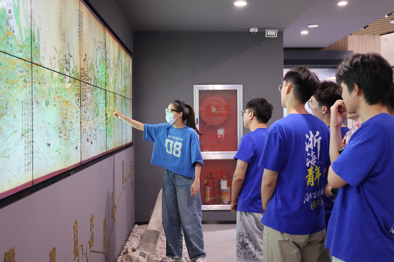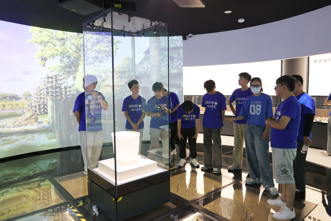 在嵊泗县博物馆,服务队成员通过参观“东海涛声”“渔业重镇”“靖海护渔”“渔风遗韵”“海上良渚”等五大展区,沉浸式了解了嵊泗渔业发展、人文变迁与海防历史,感受到这片海岛在千年间与大海共舞的独特韵味。参观过程中,服务队成员对东海涛声版块的“海疆洋界”与海上良渚版块的“黄家台遗址”表现出极大兴趣。“看到具有河姆渡文化晚期与良渚文化特征的夹砂绳纹釜、绳纹支脚、夹砂陶鼎等文物。我仿佛穿越时空逆流而上,见证了嵊泗海岛的人类定居史和开发史。” 服务队成员田一洋说道。大家还在讲解员的引导下,在《海疆洋界图》中找寻嵊泗渔场的身影,从图纸线条与文字记载中感悟古代海疆设防的智慧与嵊泗先民向海图强的探索足迹。