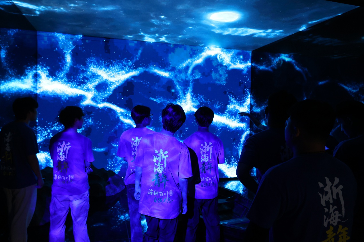 在嵊泗县海洋文化体验馆,首先映入服务队成员眼帘的是数块立体环绕的电子大银屏,放映着大黄鱼在海洋中自由游弋、生长繁衍的景象,令人仿佛置身于深海之中。场馆还以多媒体的形式系统展示了嵊泗大黄鱼的兴衰历程。从曾经的资源枯竭到如今的生态修复与渔业振兴,凸显出海洋生态保护与可持续发展的重要性。同时,场馆内还融入了沉浸式体验项目,服务队成员走入台风体验区,仿佛亲历风暴中心,感受到自然的震撼力量;在荧光海展示区,仿佛步入梦幻星河,体验海洋奇观带来的视觉冲击。整个参观过程既是一次生动的生态教育之旅,也是一场寓教于乐的海洋文化洗礼。