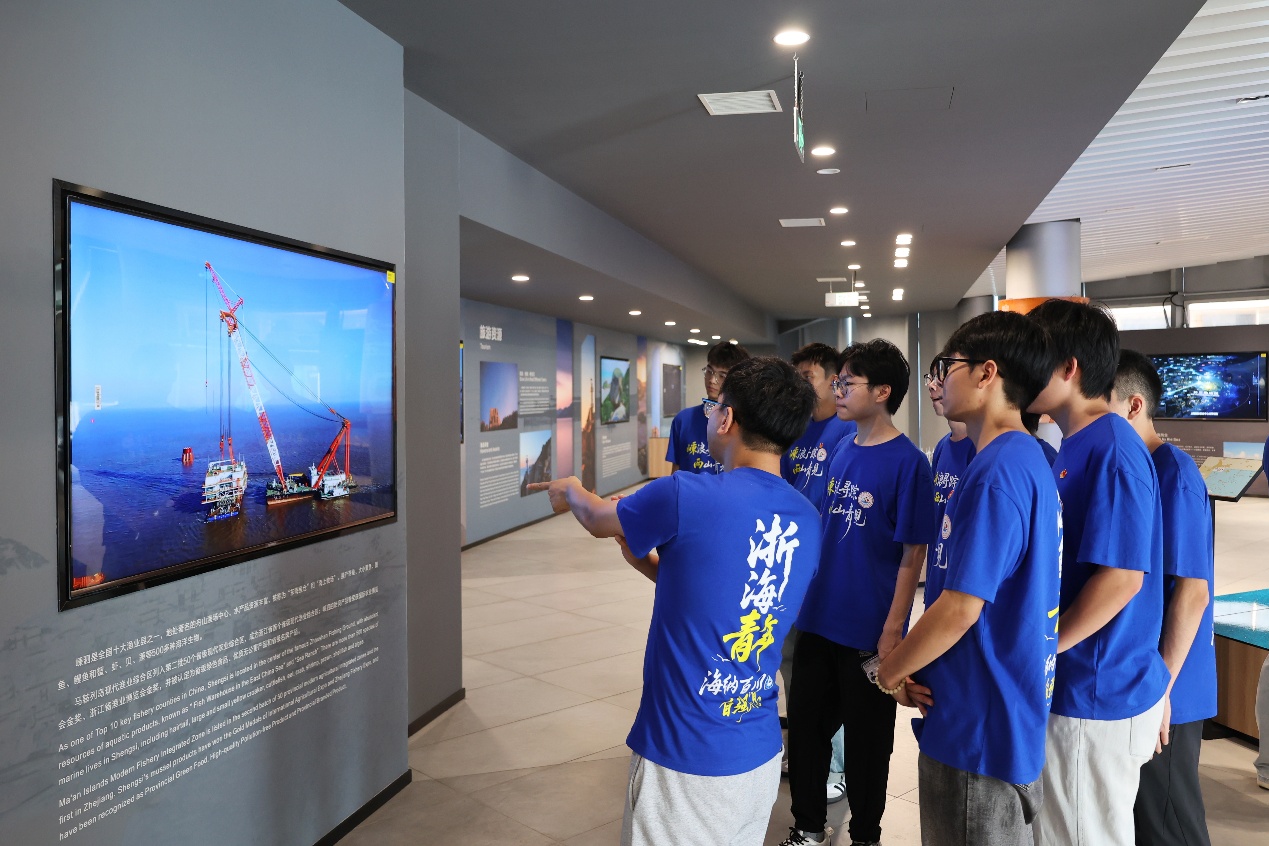 在嵊泗县规划馆,服务队成员置身于沉浸式展示空间,深入了解了嵊泗在渔业经济、海上牧场、旅游资源等方面的发展成果。通过丰富的文字介绍、珍贵的历史照片和动态的视频影像,大家系统感知了嵊泗近年来在产业融合、资源利用与生态保护中的实践成效。在讲解员的引导下,服务队成员走近港口与能源展示沙盘,直观感受嵊泗港产城融合发展的格局与全县未来的空间布局规划。站在体验区的玻璃平台上,大家仿佛穿越时空隧道,俯瞰海岛发展蓝图,对“蓝色生态海岛”建设有了更深层次的认识。大家纷纷表示,嵊泗的科学规划与绿色理念令人振奋,也为他们理解“两山”理念、探索人与自然和谐共生的实践路径提供了生动样本。