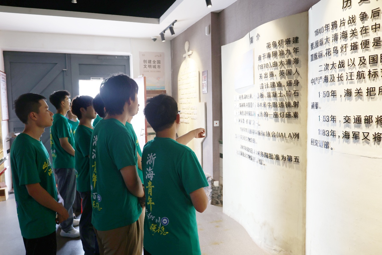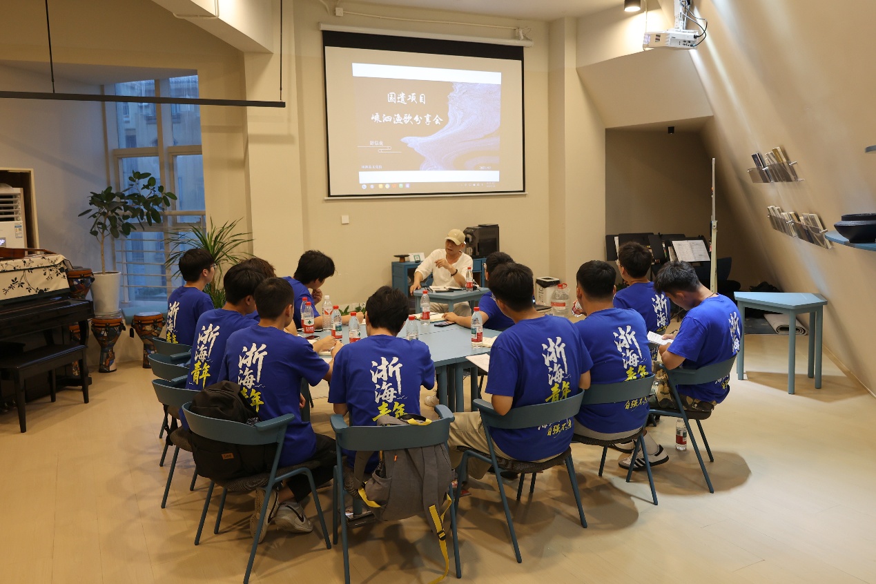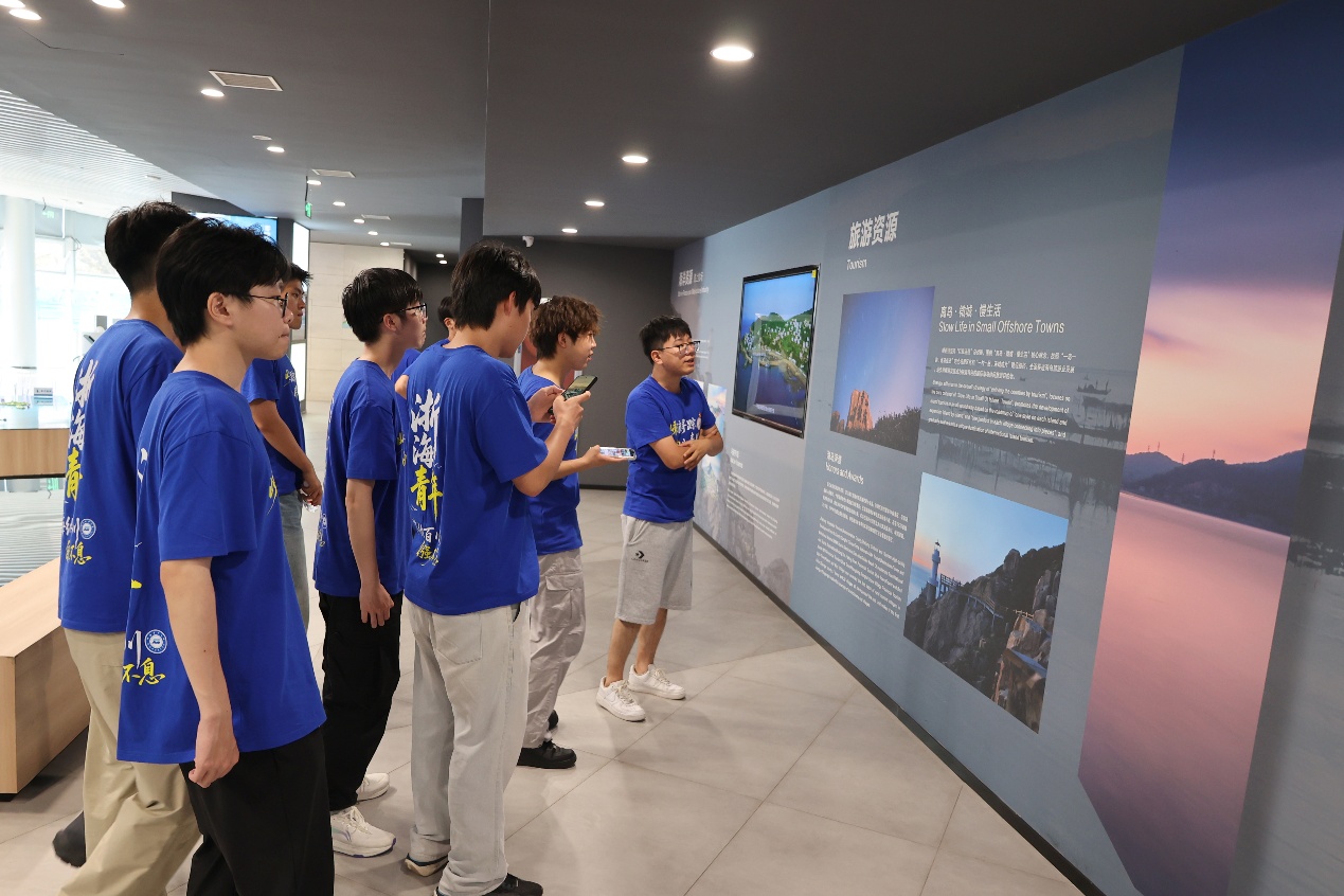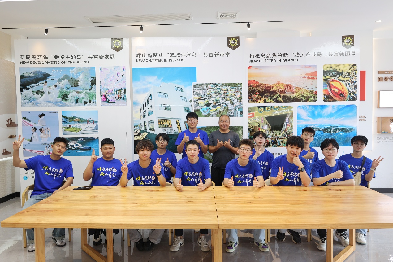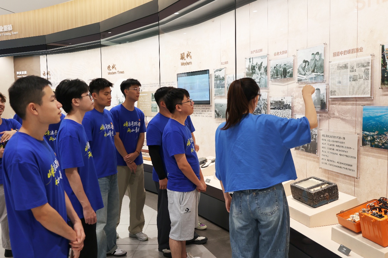 服务队还赴嵊泗县博物馆、嵊泗县规划馆、嵊泗县海洋文化体验馆等地参观学习,深入了解了嵊泗列岛得天独厚的自然资源、别具一格的渔风民俗和源远流长的海岛历史。服务队还聆听了“两山理念·青年说”理论微党课全市巡回宣讲,《一颗贻贝看“两山”》《巍巍海上狼牙山》《耕海牧渔 踏浪前行》……一节节“接地气”“冒热气”“沾土气”的微型党课,提升了他们对“两山”理念的共鸣共识与情感认同。队员们还在嵊泗县国遗项目嵊泗渔歌传承人、五龙乡新的社会阶层人士舒信虎的带领下,学唱嵊泗渔歌。《带鱼煮冬菜》《东西南北风》《摇橹谣》……一首首旋律悠扬、饱含海味与乡愁的渔歌在耳畔回荡,让队员们在吟唱中感受到海岛人民的勤劳智慧与深厚情感,也激发了他们对海洋非遗保护和传承的思考与责任。