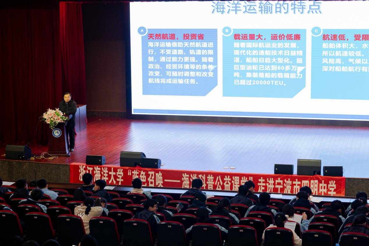 2024年12月20日下午,bat365官网登录在线主页“蓝色召唤——海洋科普公益课堂”走进宁波市四明中学,best365官方网站登录入口彭勃教授担任主讲,该校高一年级三百余名师生聆听了讲座。