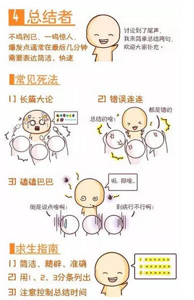 2、根据讨论的环境和个人基本特质,找准自己合适的角色定位,灵活应对。