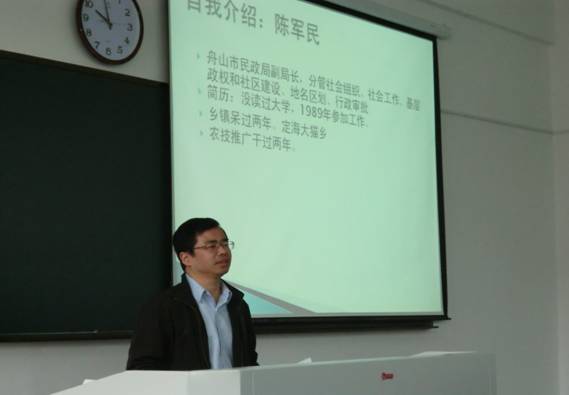 11月13日上午,为贯彻学院“走出去,请进来”课堂教学改革需要,应管理学院的邀请,舟山市民政局副局长陈军民就“浙江舟山群岛新区渔农村基层组织状况”这一主题,与A11行政班的同学进行了讲授和交流互动。