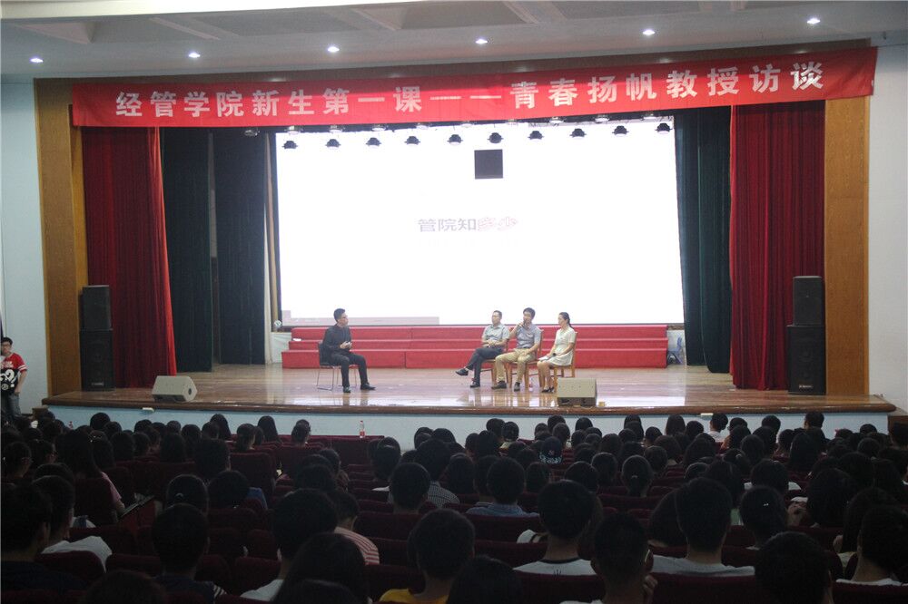 9月20日下午,浙江海洋学院best365官方网站登录入口在定海青少年宫活动中心开展了“新生第一课”教授访谈活动。此次活动一改往常开学典礼式新生教育模式,采用学院领导与学生亲密互动的访谈形式,受到全院师生的广泛好评。学院党委书记、副院长全永波教授,学院副院长周学锋教授,学院党委副书记应军副教授应邀参加教授访谈,学工办老师、全院近500名新生出席了此次活动。
