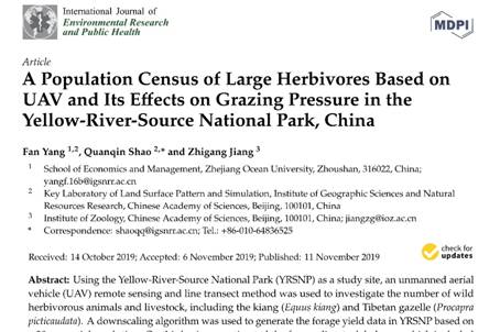 2019年11月11日,best365官网杨帆博士作为第一作者,在国际著名生态环境领域期刊《International Journal of Environmental Research and Public Health》(SSCI一区;影响因子2.468)发表了在野生动物保护领域的最新研究进展,题目为《A Population Census of Large Herbivores Based on UAV and Its Effects on Grazing Pressure in the Yellow-River-Source National Park, China》。该论文与中国科学院地理科学与资源研究所邵全琴研究员课题组开展了合作。