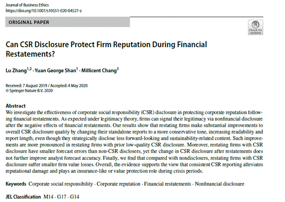 2020年5月4日,张璐老师作为第一作者在国际期刊《Journal of Business Ethics》(SSCI一区,影响因子3.796)发表了关于企业社会责任披露对于财务重述后的公司声誉影响的研究论文。