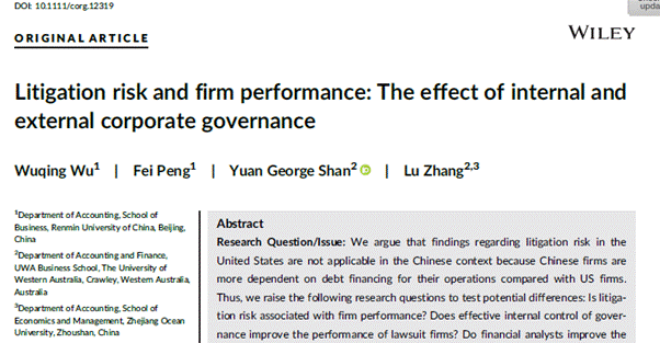 2020年4月8日,张璐老师参与中国人民大学吴武清教授团队,作为共同作者在国际期刊《Corporate Governance: An International Review》(SSCI一区,影响因子3.39)发表关于企业诉讼风险与公司绩效关系的最新分析。