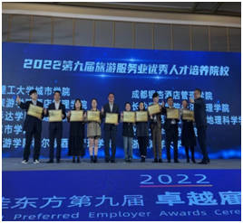 2022最佳东方高峰论坛暨第九届“2022年旅游服务业优秀人才培养院校 卓越雇主”颁奖盛典11月11日在杭州良渚洲际酒店盛大启幕。优秀人才培养院校奖项是通过“培养方案产学融合、专业课程改革创新、院校与企业的教职人员教研互动、专业教学培养质量”四大评选维度,甄选出全国优秀院校标杆。在本轮评选中,bat365官网登录在线主页首次荣获“最佳东方旅游服务业2022优秀人才培养院校”奖,该奖项的获得是对我校人才培养的高度肯定。