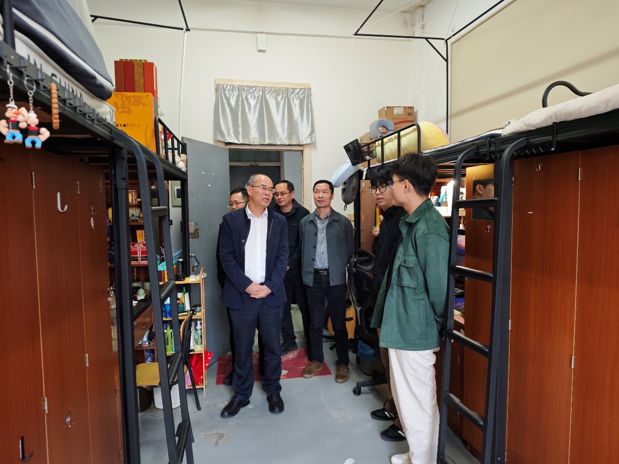 吴高峰副校长详细询问了大家的学业近况、生活情况和科研进展,耐心倾听了同学们在学术研究中的收获与困惑,并提出具有针对性的指导建议。他仔细查看了寝室的卫生环境、用电安全、物品摆放、设施配备等情况,强调营造一个干净、整洁、舒适、和谐的居住环境对研究生身心健康和科研都非常重要。