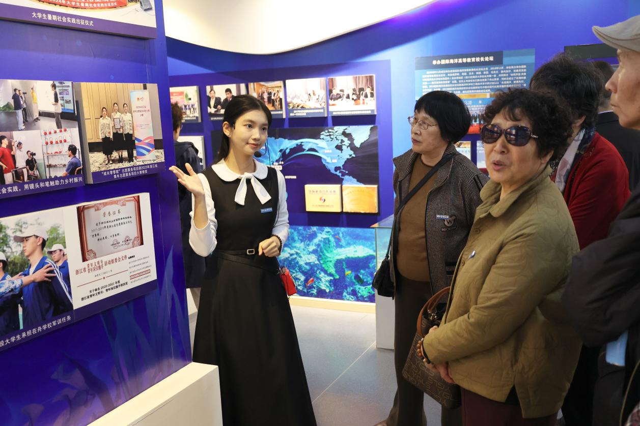 在母校的组织下,校友们来到了校史馆。墙上的照片、陈列的物件、播放的影像,仿佛将时间定格在了50年前的那个金秋,带着他们重新走进那个初见时的海大校园。校史馆展示着学校从成立初期到如今一步步的发展历程:从专业的增加、学科的拓展,到科研水平的提升、校园环境的日新月异,它承载着一代代海大人不懈努力的印记。