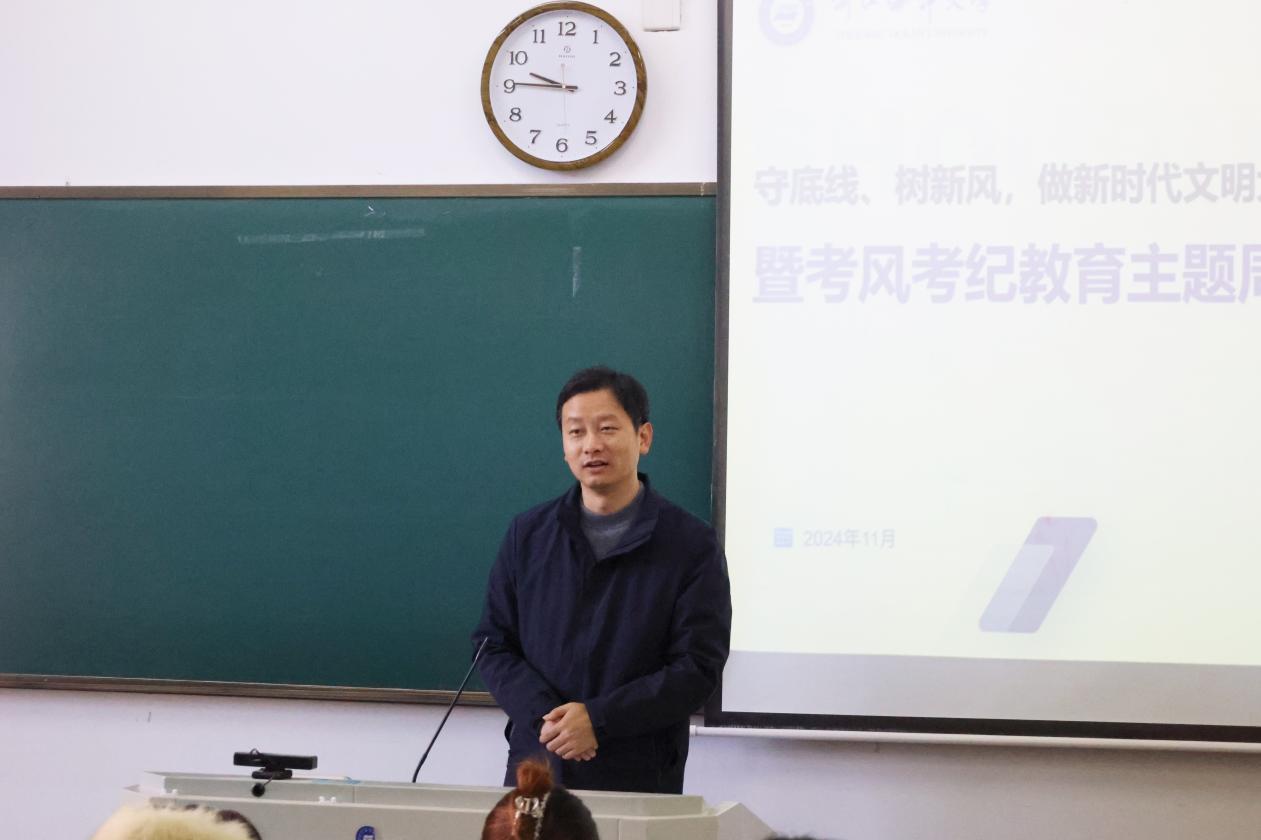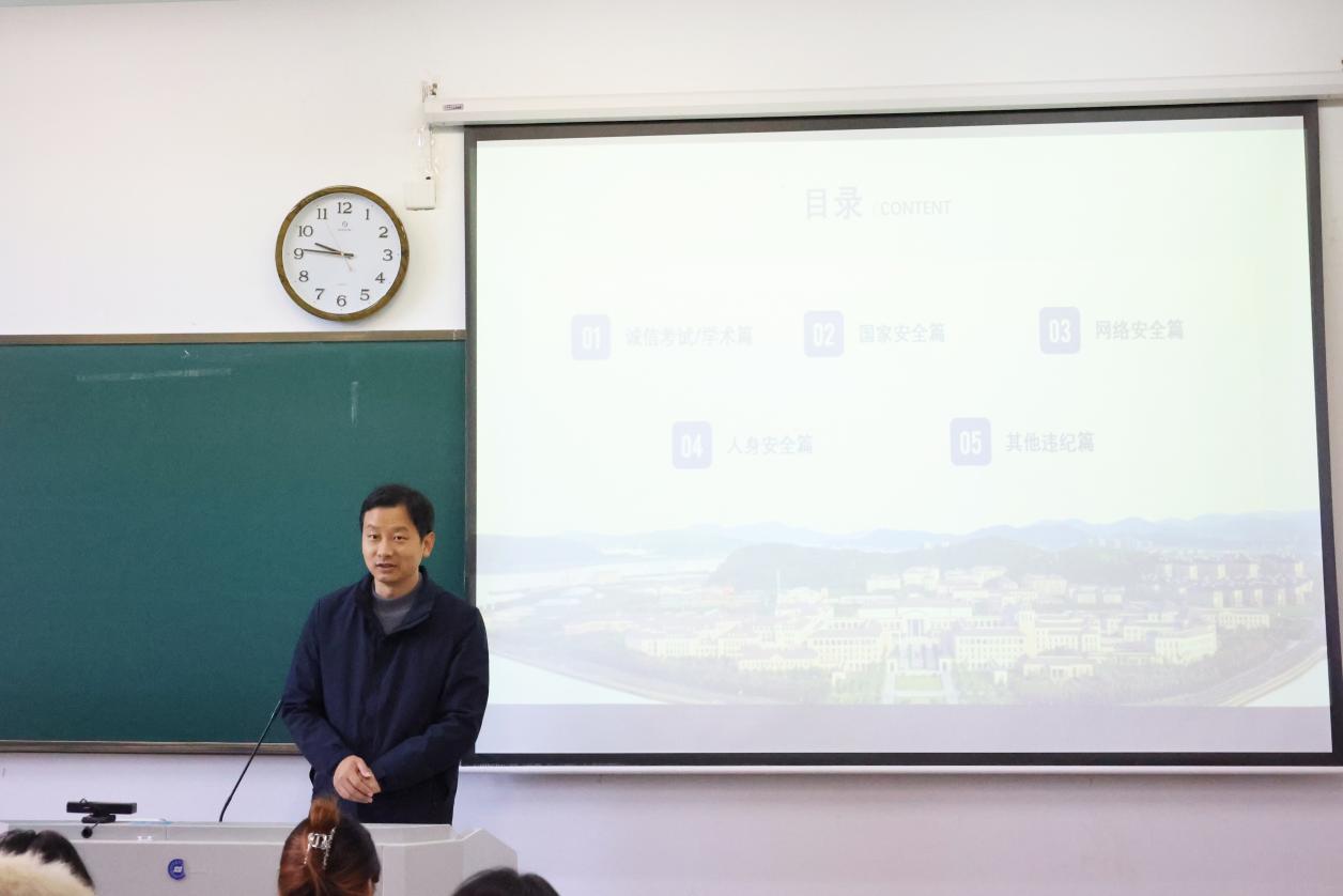 史伟老师从诚信考试篇、国家安全篇、网络安全篇、人身安全篇、其他违纪篇等五个部分展开,带领同学们重点学习了《高等学校学生行为准则》《国家教育考试违规处理办法》《bat365官网登录在线主页本科学生违纪行为处理规定》等相关文件精神。史老师以平实的语言、真切的情感将校内外案例与规章制度相结合,以生动鲜活的故事、触目惊心的数据,直观展现违纪行为带来的严重后果,让同学们深切领悟遵规守纪的重要性与必要性。