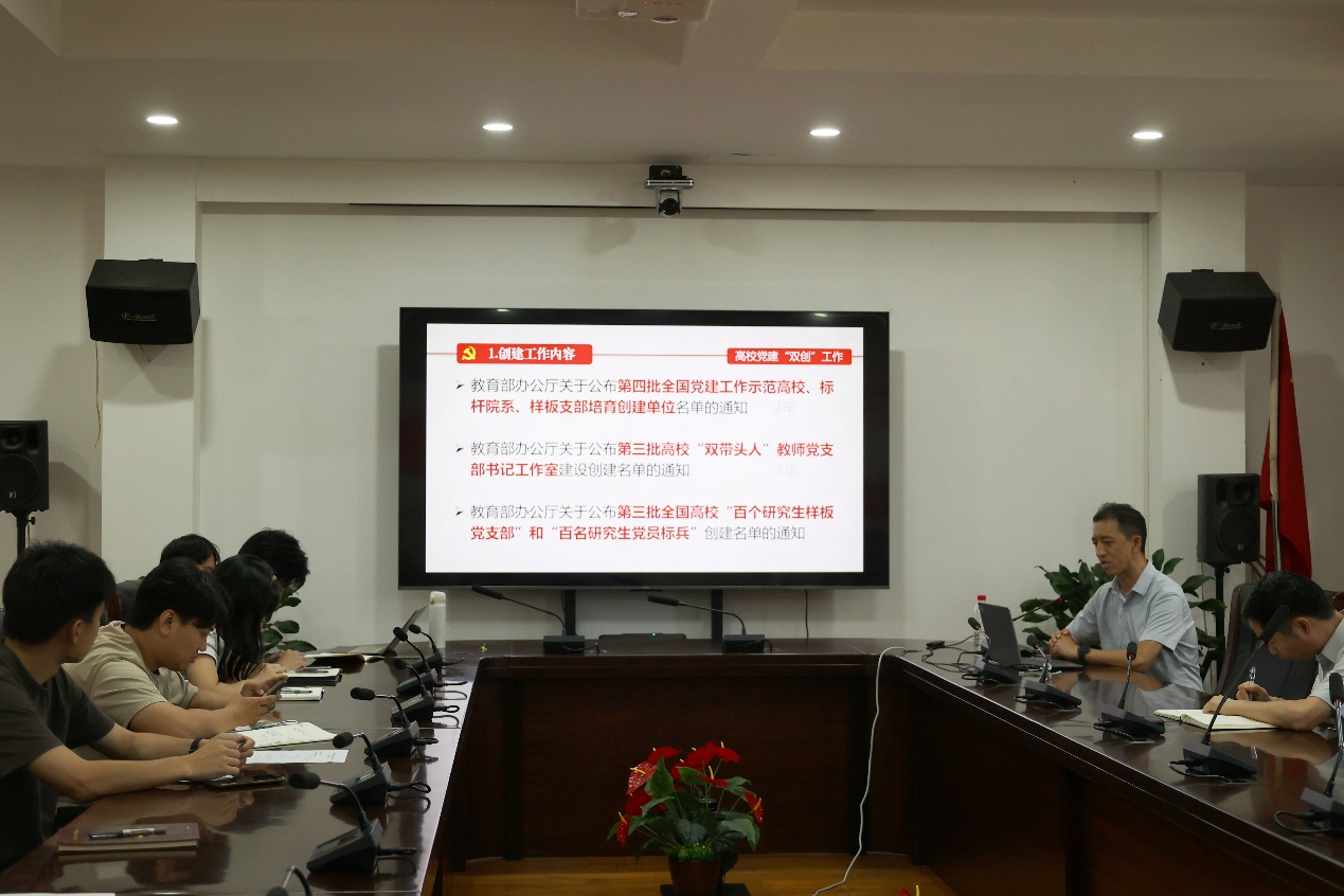 学院党委组织员张敏红对“红色根脉强基工程”中“三会一课”和主题党日活动的录入时间节点、毕业生党员党组织关系转出事宜、党员教育工作计划、党建“双创”工作重点任务作了细致解读和明确部署,进一步强调了规范化、制度化落实的重要性,要求各支部严格按照时间节点高质量完成相关工作,切实把党建责任压实到人、落实到事,推动学院党建工作提质增效。