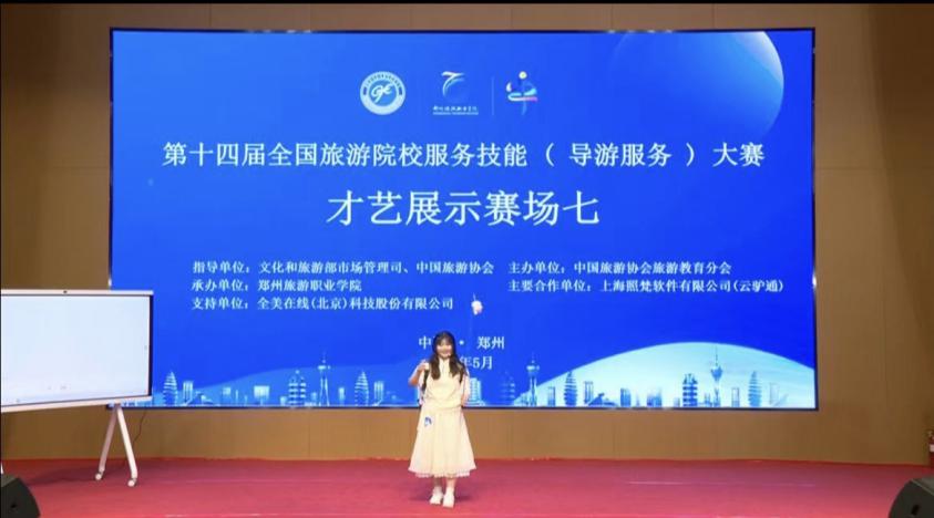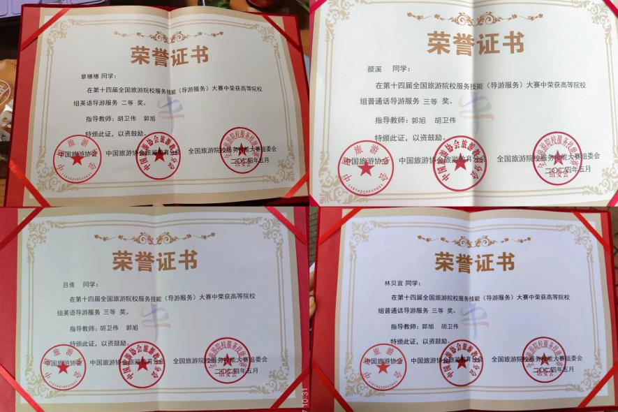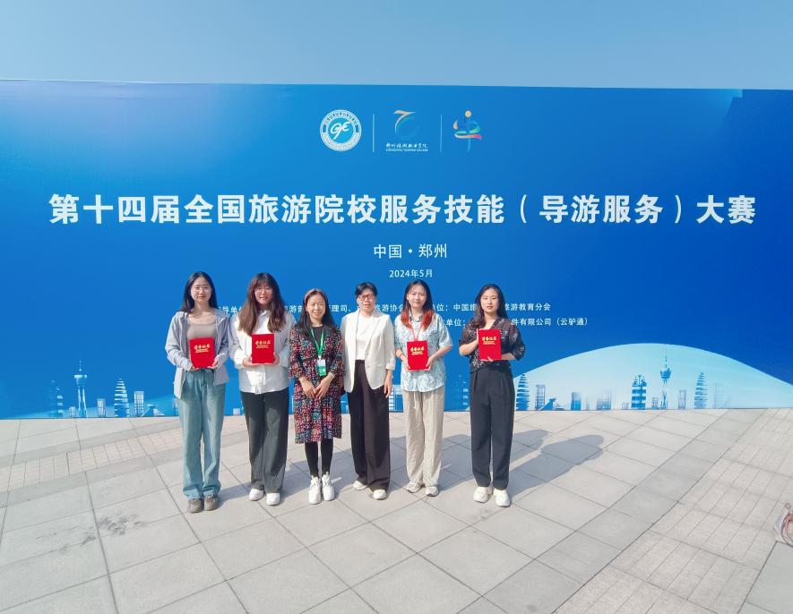 为深入学习贯彻党的二十大精神,落实习近平总书记关于旅游发展和高等教育的重要指示,助推旅游业成为新兴的战略性支柱产业和具有显著时代特征的民生产业、幸福产业,促进旅游高等教育高质量发展,2024年5月23日至5月26日,第十四届全国旅游院校服务技能(导游服务)大赛在郑州举行。由best365官方网站登录入口旅游管理系胡卫伟、张敏红、刘丹丹、卫玉倩老师带队,中文组2名同学和英文组2名同学参赛。历经三天激烈的比赛,A21旅游2章穗穗获高等院校组英语导游服务二等奖、A22旅游2吕倩获高等院校组英语导游服务三等奖、G21旅游颜溪和G22旅游林贝宜获高等院校组普通话导游服务三等奖。