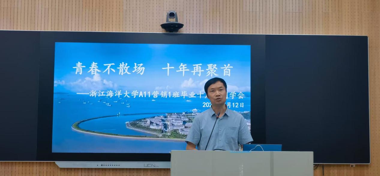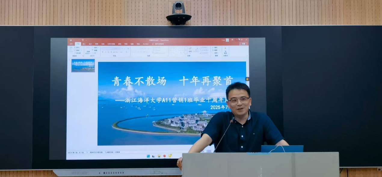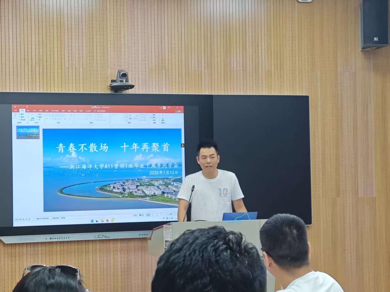 光影回溯,共话流年。陈秋桥校友通过指尖划过教室电脑的触摸屏,就此光影在十年时空中架起桥梁。大一启航,泛黄照片唤醒起点:拿到录取通知书的喜悦,图书馆、老校门、波浪教学楼、田径场、六人间寝室、舟山同乡录老照片的记忆流年。校友们一起重温“金秋素爽,丹桂飘香”的开学盛典与首个中秋晚会活动,抢凳子的欢笑、合唱《你的眼神》、徐世伟校友悠扬的《姑苏行》笛音,此刻历历在目;大二积淀,照片定格:“勿忘九一八”班会的肃穆、晨读的专注、送别周辉俊校友参军的感动、特色寝室合影、记录点滴的班级视频,各位校友在陈桥秋校友的讲述下一一回忆;大三抉择,画面流转:换寝室的忙碌、班委换届的活力、实习初探的期待、职业规划讨论的青涩与认真随着屏幕闪动;大四启程,镜头聚焦:招聘会的奔波、论文的伏案、同窗婚礼的喜悦、毕业照的笑与泪,一张张照片的背后是校友们共同经历的故事。而毕业后的精彩由校友们各自讲述,分享这十年来的人生感悟、事业成就、生活趣事,校友们虽然天各一方,却因为母校将他们紧紧联系在一起。