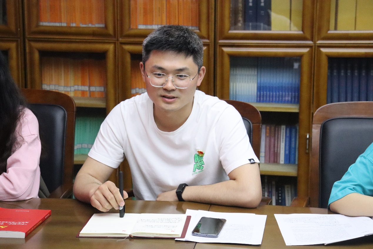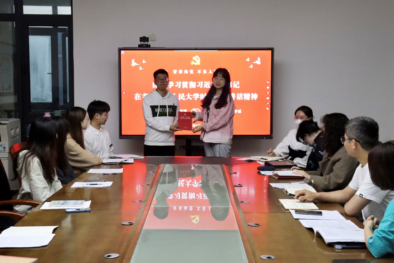 会议伊始,两支部师生党员共同观看学习了习近平总书记考察中国人民大学的新闻报道。随后,施辰阳老师就习近平总书记对广大青年的寄语和要求进行了总结梳理,并结合自身经历进行了深入解读。施老师指出,新冠疫情背景下,广大青年可能会迷惘、踯躅、困惑,但更应明确目标,做好规划,不打无准备之仗,在实现中华民族伟大复兴的时代洪流中,踔厉奋发,勇毅前进。