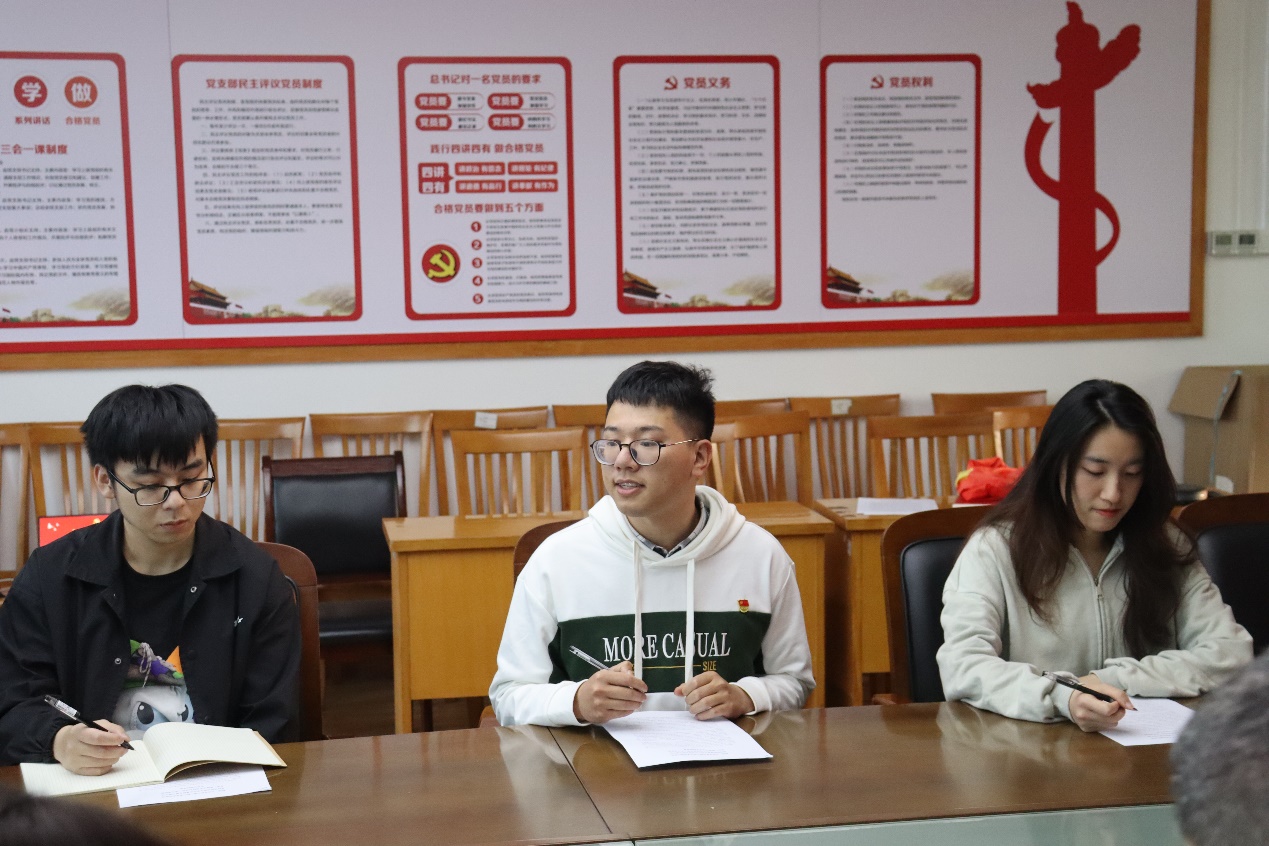 接着,两支部党员就习近平总书记重要讲话精神展开了深入讨论。来自财务管理专业学生第二党支部的黄佳宁、周浩锋同学以及药学系学生党支部的韩榕、叶韩薇同学,结合专业实际、校情国情分享了自己的感悟和见解。大家纷纷表示,会坚定不移听党话、跟党走,努力成长为堪当民族复兴重任的时代新人。讨论过后,双方就支部建设、党日活动、党员未来发展与规划等方面进行相互探讨,施辰阳和吴宇老师就大家提出的问题逐一进行了解答,也希望未来双方要多进行探讨学习,进行更深层次的交流。
