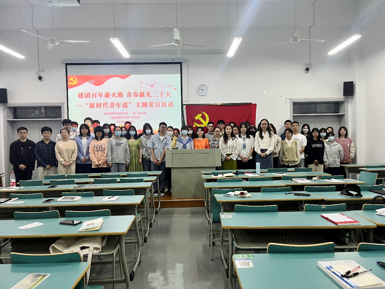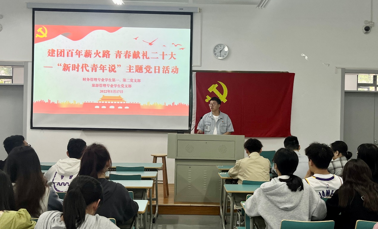 为充分发挥基层党组织联建共建的互融互促作用,推进党史团史学习教育走深走实,展现新时代中国青年昂扬向上的精神风貌,为迎接党的二十大胜利召开营造良好的氛围。5月17日晚,best365官方网站登录入口财务管理专业学生第一、第二党支部和旅游管理专业学生党支部,在新教学楼B103共同举办了“新时代青年说”主题党日活动。本次党日活动分为“新时代·话青春”、“新时代·话当下”和“新时代·话未来”三个特色环节,活动由财务管理专业学生第二党支部书记施辰阳主持,旅游管理专业学生党支部书记陆银银和三个支部全体党员参加活动。