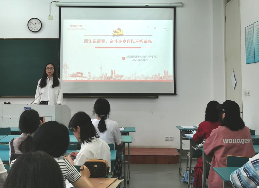 为了深入学习贯彻习近平总书记在庆祝中国共产主义青年团成立100周年大会上的重要讲话精神,引领广大党员把青春奋斗融入党和人民事业。5月20日中午,best365官方网站登录入口旅游管理专业学生党支部在公共教学楼121开展了“百年正青春,奋斗许岁月以不朽荣光”党课活动。本次党课由支部书记陆银银老师主讲,支部全体党员参与此次学习活动。
