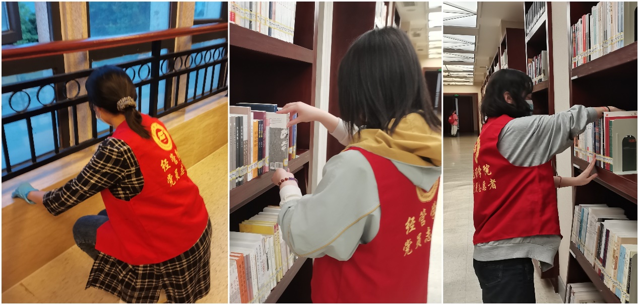 在图书馆有关负责人的带领下,志愿者们有组织地分组分楼层进行活动,志愿内容包括拖地、擦窗台、整理书架等。