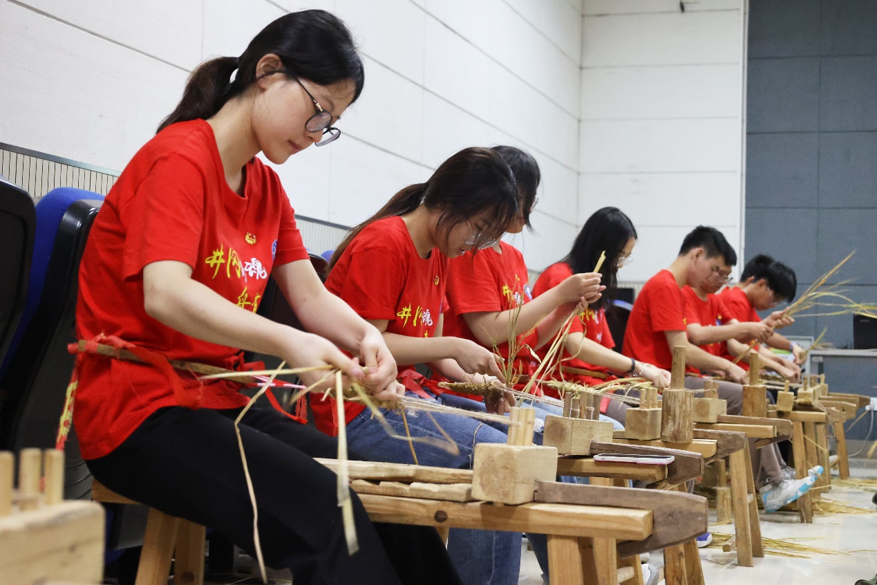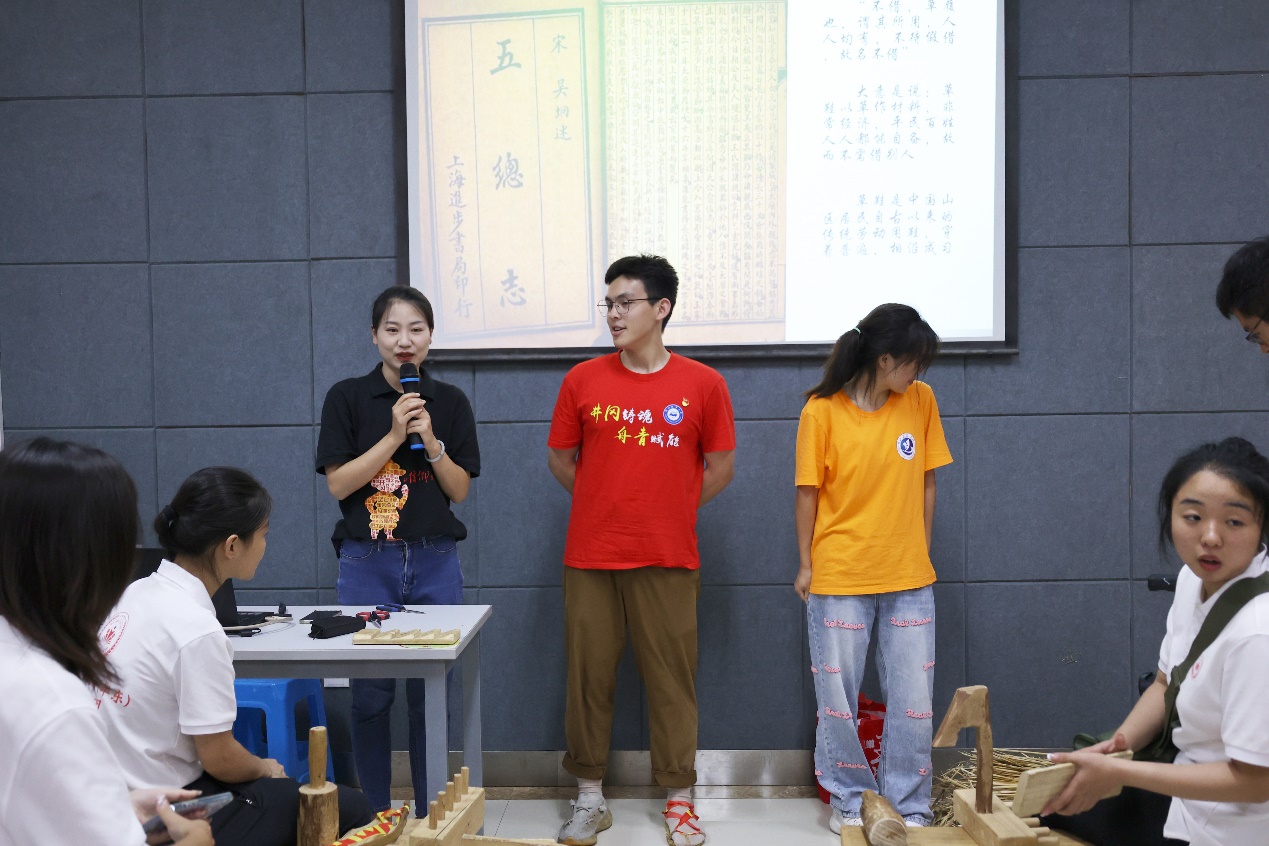 研学基地的姚瑶老师以一首草鞋歌为引,将红军草鞋背后的故事和勤劳节俭、艰苦奋斗的“草鞋”精神娓娓道来。随后,编织师傅现场展示制作技艺,指导实践团成员如何编制草鞋。一条草绳,一上一下,一系一搓,一挽一编,一压一敲,不一会儿,一只柔韧、坚实的草鞋就制作完成了。实践团成员看得聚精会神,跃跃欲试。伴随着稻草的沙沙摩擦声,木槌的咚咚敲击声,一只只编好的草鞋“新鲜出炉”,同学们从最初的“门外汉”逐渐变成精通技巧的“行家里手”。在编制草鞋的过程中,实践团成员一边埋头苦干,一边感叹着党和红军的军事智慧。当穿上亲手编制的草鞋,同学们更是感慨良多,很难想象当年红军就是穿着这样的鞋跋山涉水,最终取得胜利。