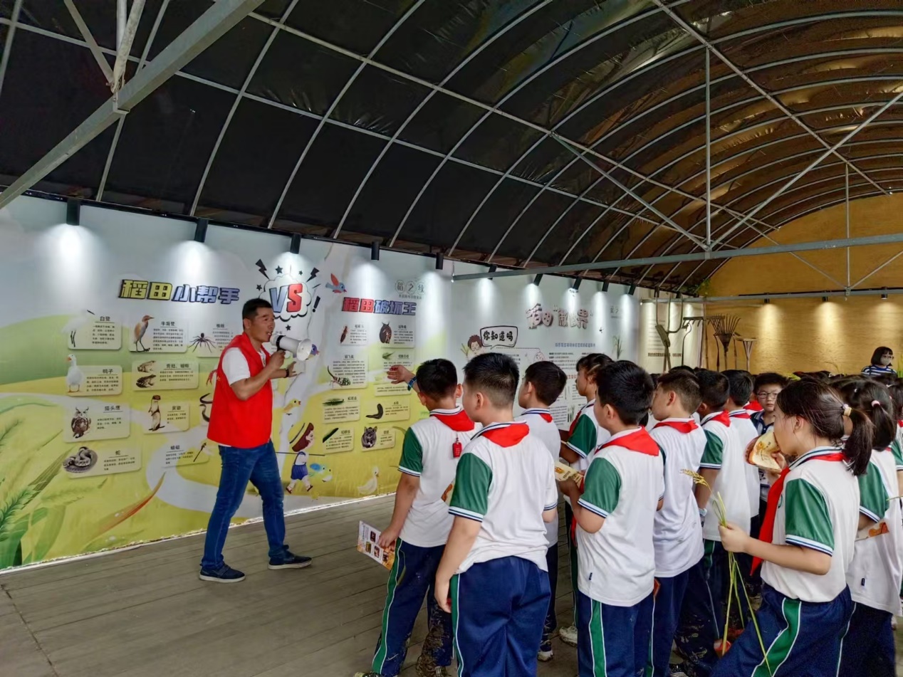 在水稻文化馆,同学们聆听了农场主孙舟恩老师对水稻种植和农田生态系统的深入讲解,学习了多种品种作物的特征,进一步了解了“杂交水稻之父”袁隆平院士的“禾下乘凉梦”和他所取得的伟大成就,并在此过程中学会了多种技能,如大米品种的辨别、收割稻谷的方式,深刻认识了稻谷在日常生活中的重要作用和不可替代的价值。