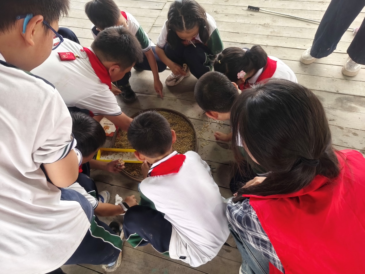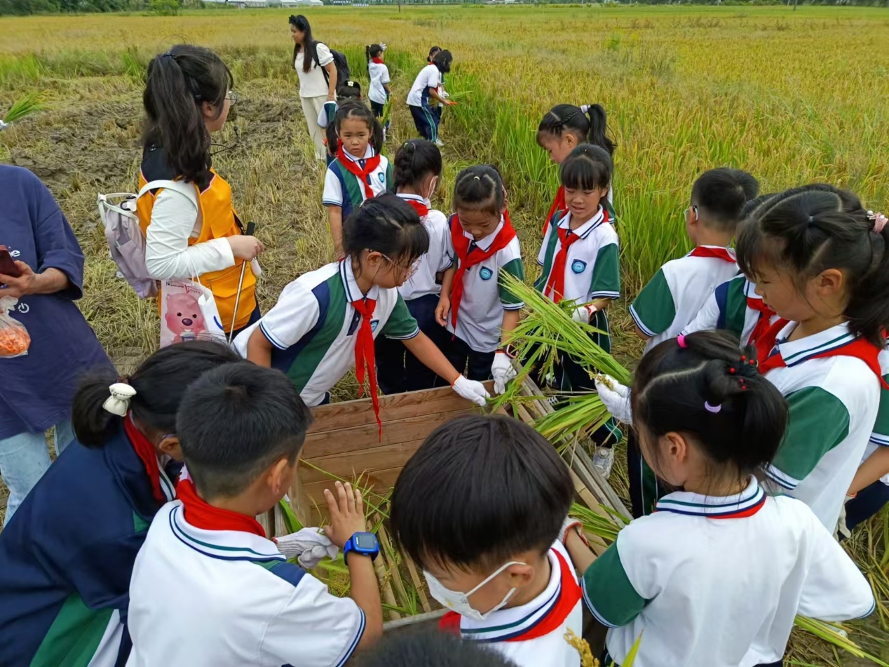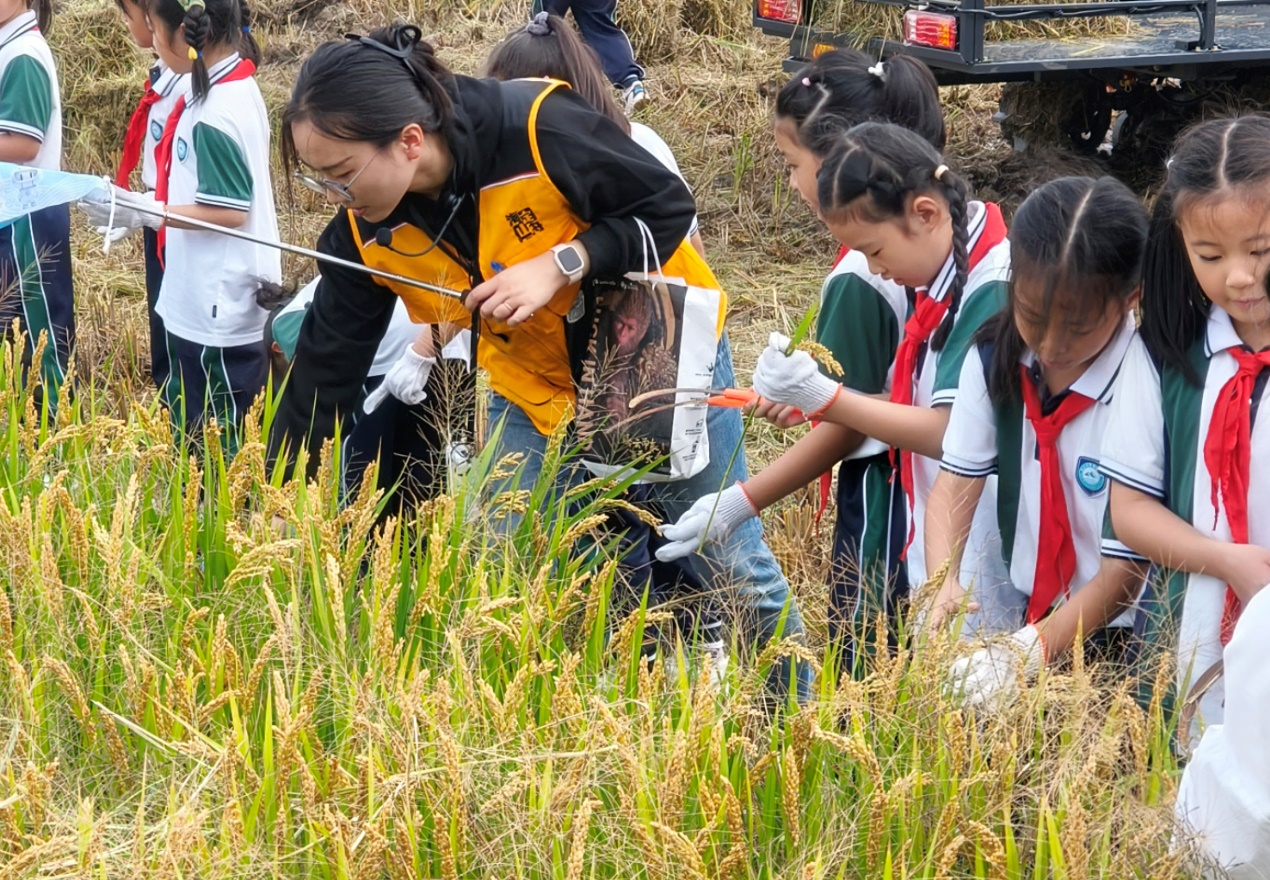 在孙舟恩老师的带领下,党团队员们还共同体验了割稻谷和打稻谷活动。在活动中,同学们带领少先队员亲自下田体验了割稻谷和打稻谷的全过程,亲手操作农具,感受到了传统农耕劳动的辛苦与收获的喜悦。在田间劳作中,党团队员们不仅增强了对粮食生产的理解,也进一步体会到了劳动的价值和农业的艰辛,激发了他们对农业劳动者的敬意和珍惜粮食的意识。通过这种亲身参与的方式,同学们在实践中提升了动手能力,培养了吃苦耐劳的精神。